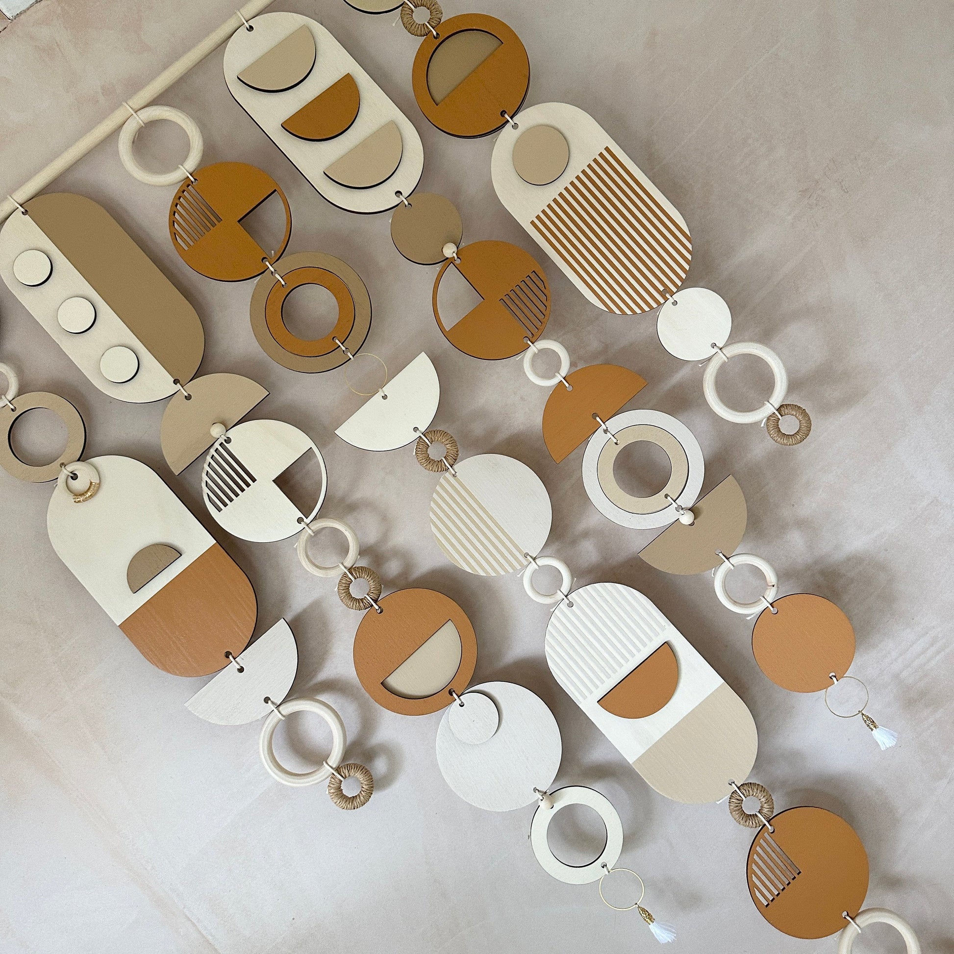 Lovingly handmade modern wall art. This Piece is made from plywood, paint, waxed cord, tassels and wooden beads. The colours used are Sandy Earth tones. This large wall hanging would make a beautiful addition to any room to create a modern mid-century feel. Made from sustainable plywood, hand painted and constructed in Milton Keynes, England.