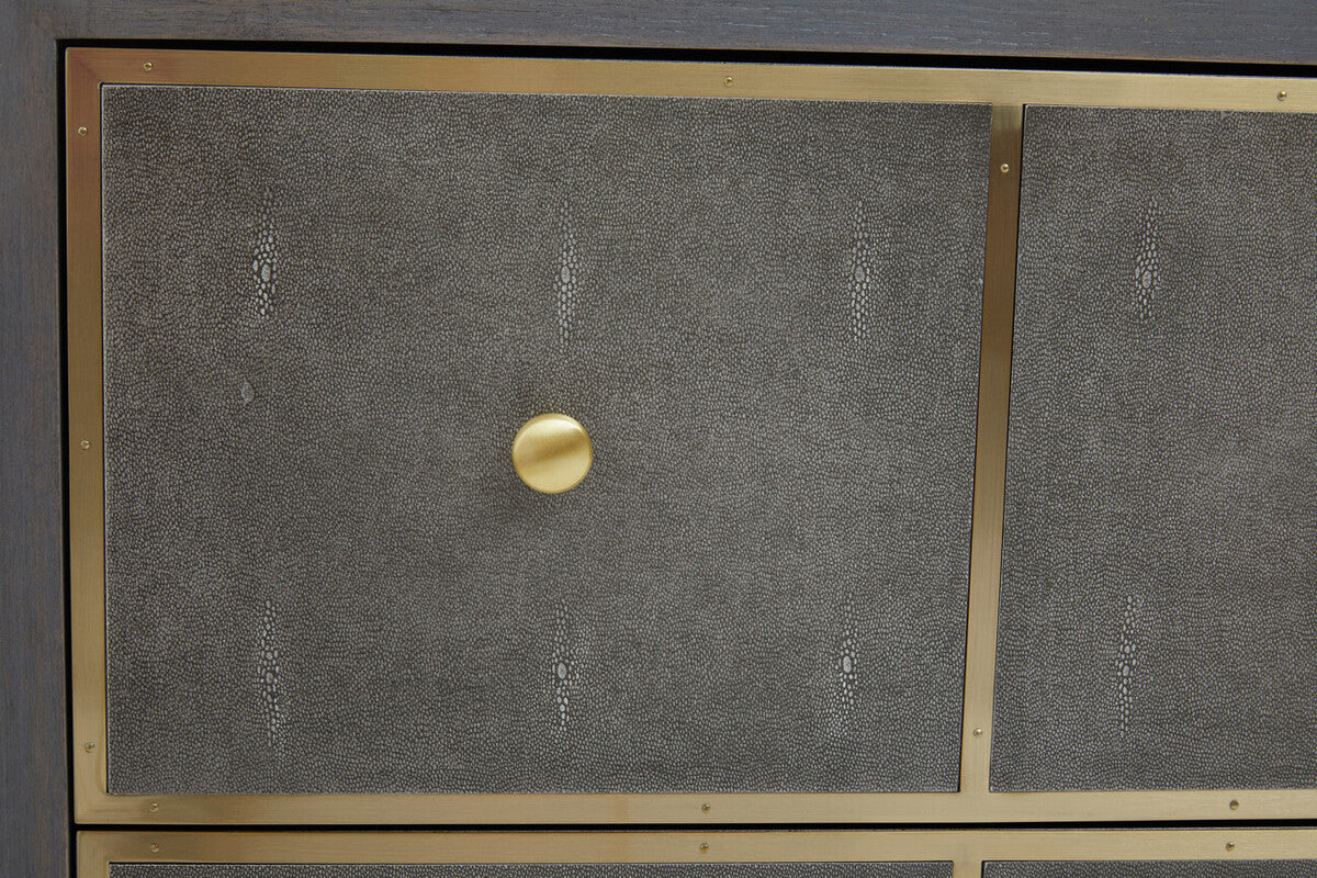 The shagreen effect finish introduces a subtle pattern that looks elegant from every angle. Warm metallic hardware punctuates the drawers, and the sledge-style base adds a light, contemporary stance that complements modern seating and clean-lined storage. This console is equally at home behind a sofa, along a corridor, or as a sleek dressing-room anchor.