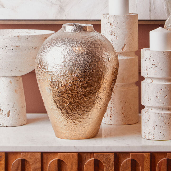 Insert a small arrangement of faux eucalyptus or leave it unfilled to emphasise the gradient. Combine with the larger Dion pieces for a tiered metallic story. On a desk, set it near a nickel pen cup to link cooler tones with warm brass drawer pulls.