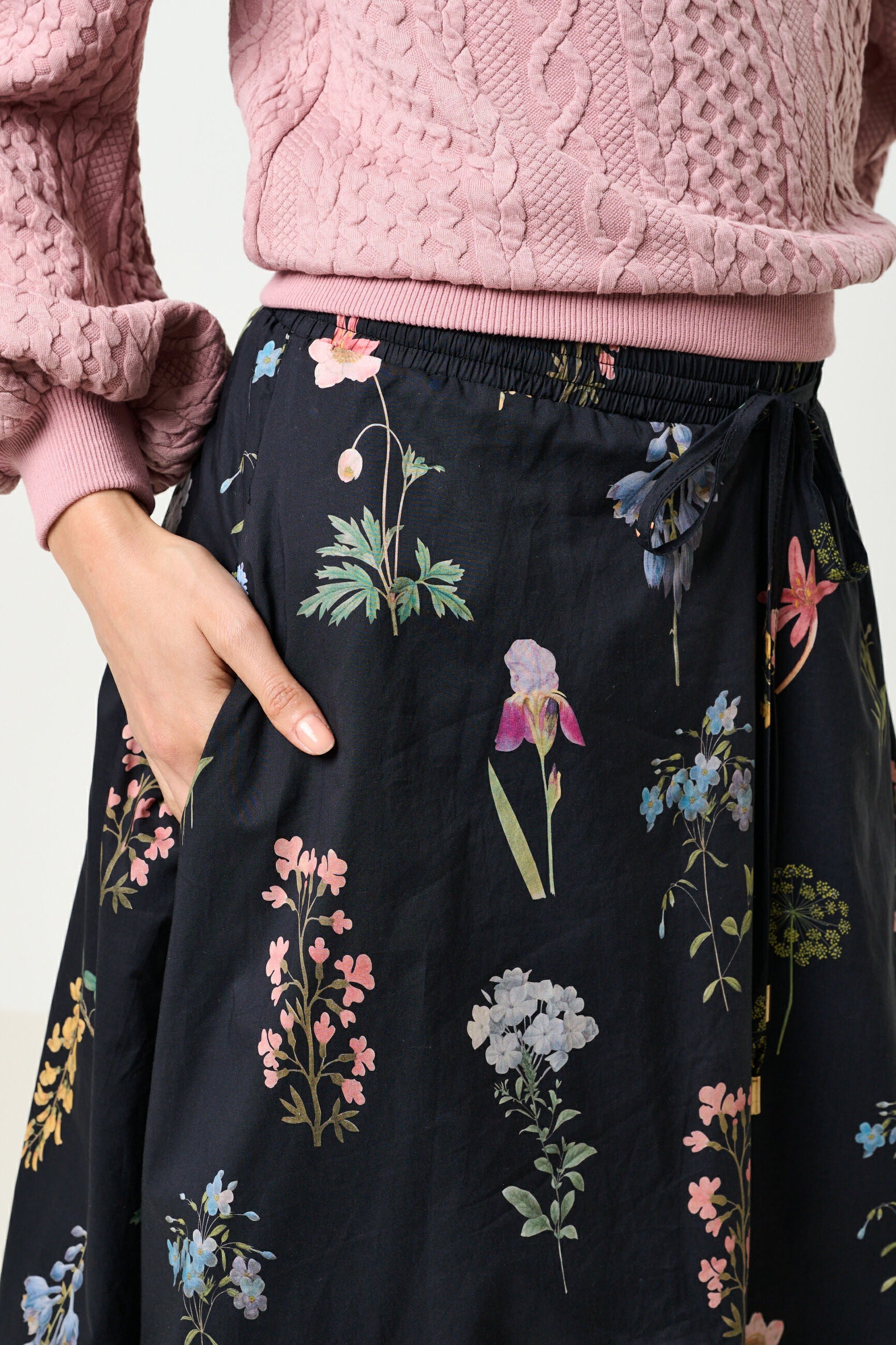 Meet your new go-to: a midiaxi skirt that does comfort without compromise. Crafted in soft cotton deep navy-based pressed flower botanical print that whispers rather than shouts. The bubble hem brings a cheeky flourish, while the elasticated waist means you can move freely—whether you're dashing between meetings or settling in for the evening. Effortless style, every wear.
