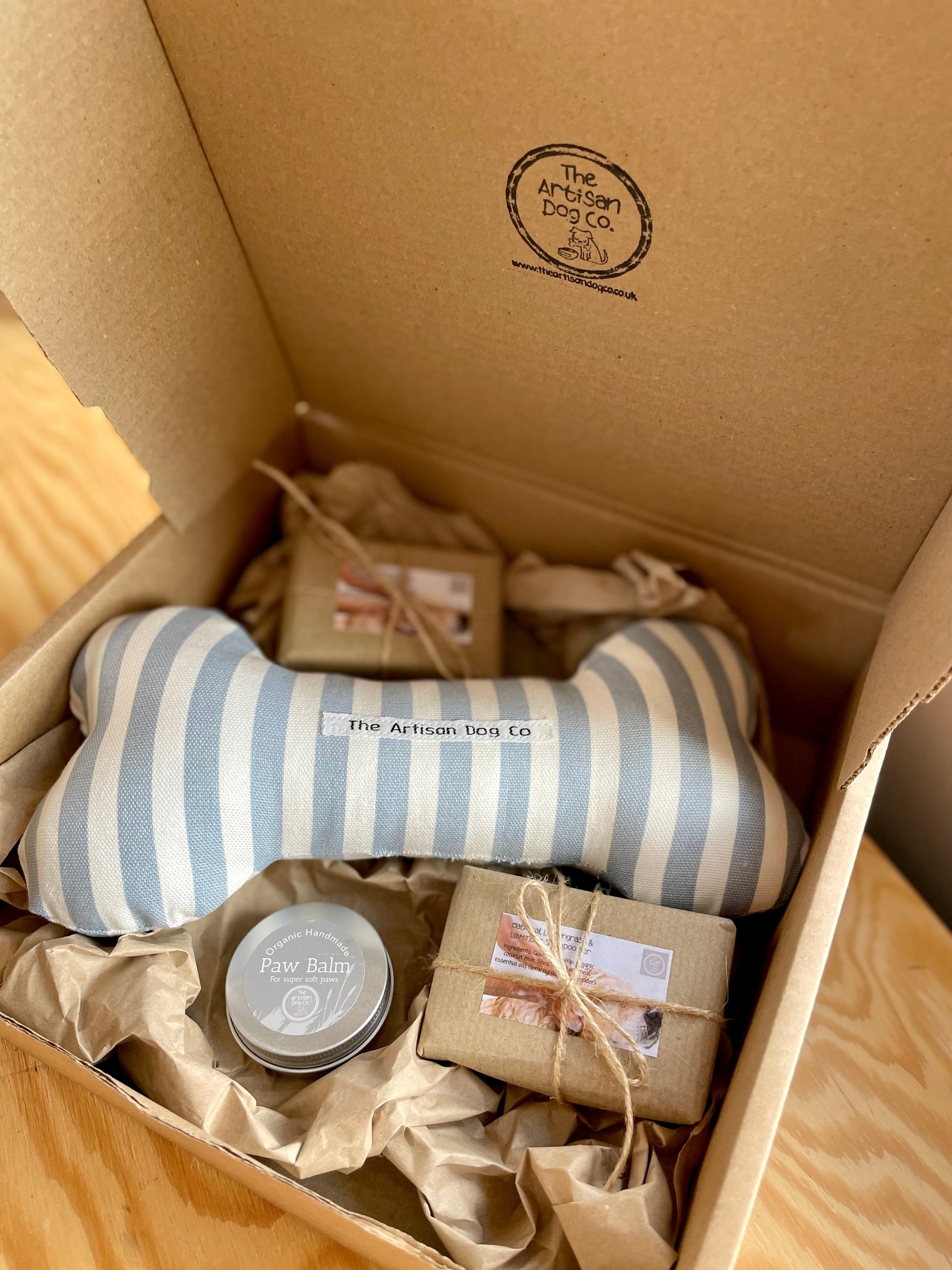 Contents: Handmade squeaky toy bone; 2 handmade Oatmeal, Lemongrass and Lavender Shampoo Bars and a 30ml Paw Balm.