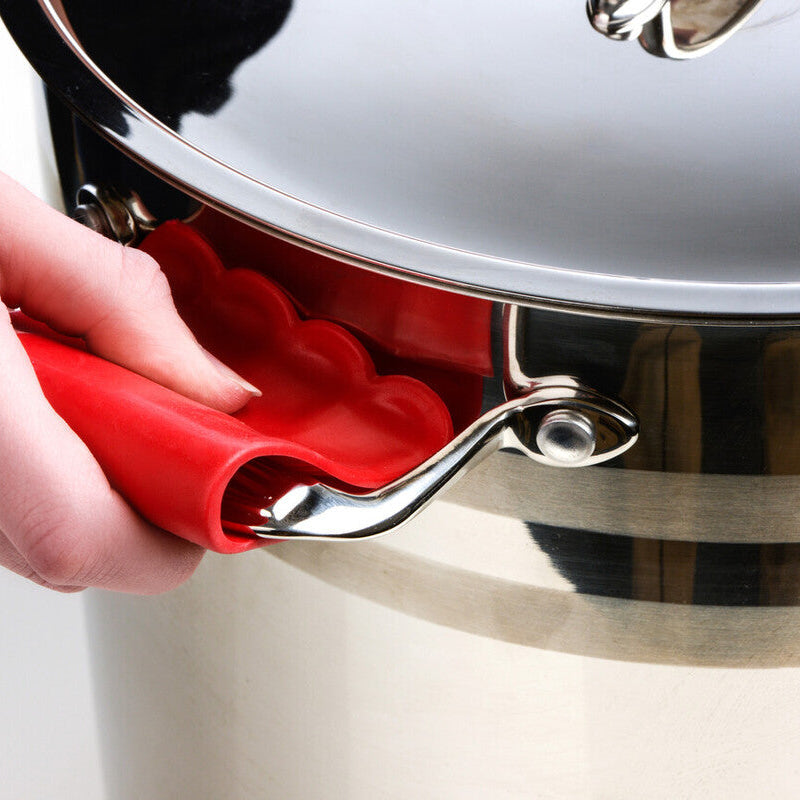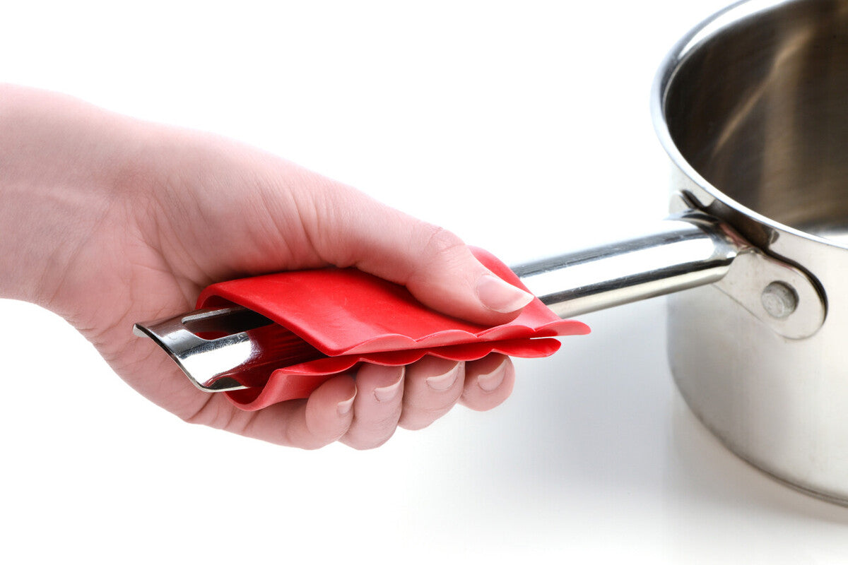 - Set of 2 anti-scald grips made from red TPR for handling hot cookware more securely.