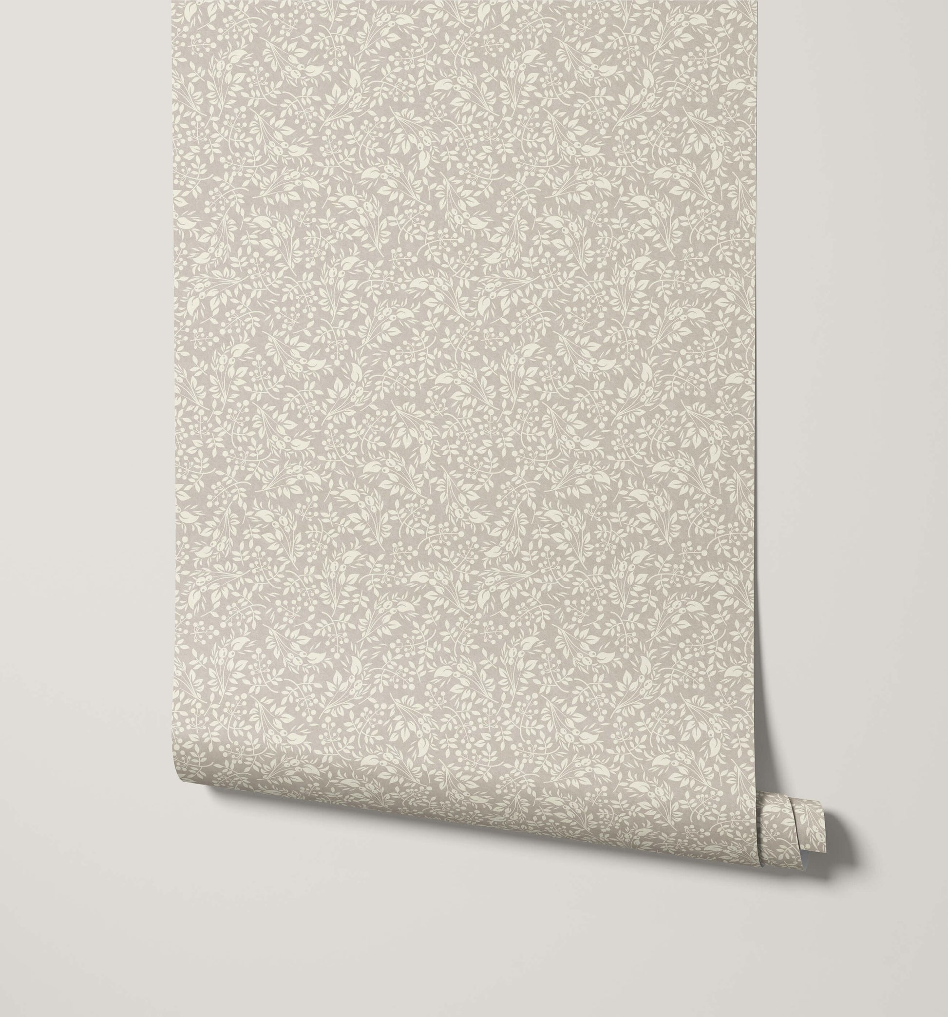 The cottagecore floral wallpaper captures the dense, naturalistic charm of a wild, rambling garden, perfect for creating an idyllic and cozy atmosphere. This design features a very small-scale, continuous repeat of delicate sprigs, tiny leaves, and berry clusters tightly packed across the surface. The high density of the pattern results in a beautiful, all-over texture that feels intricate and organic.
