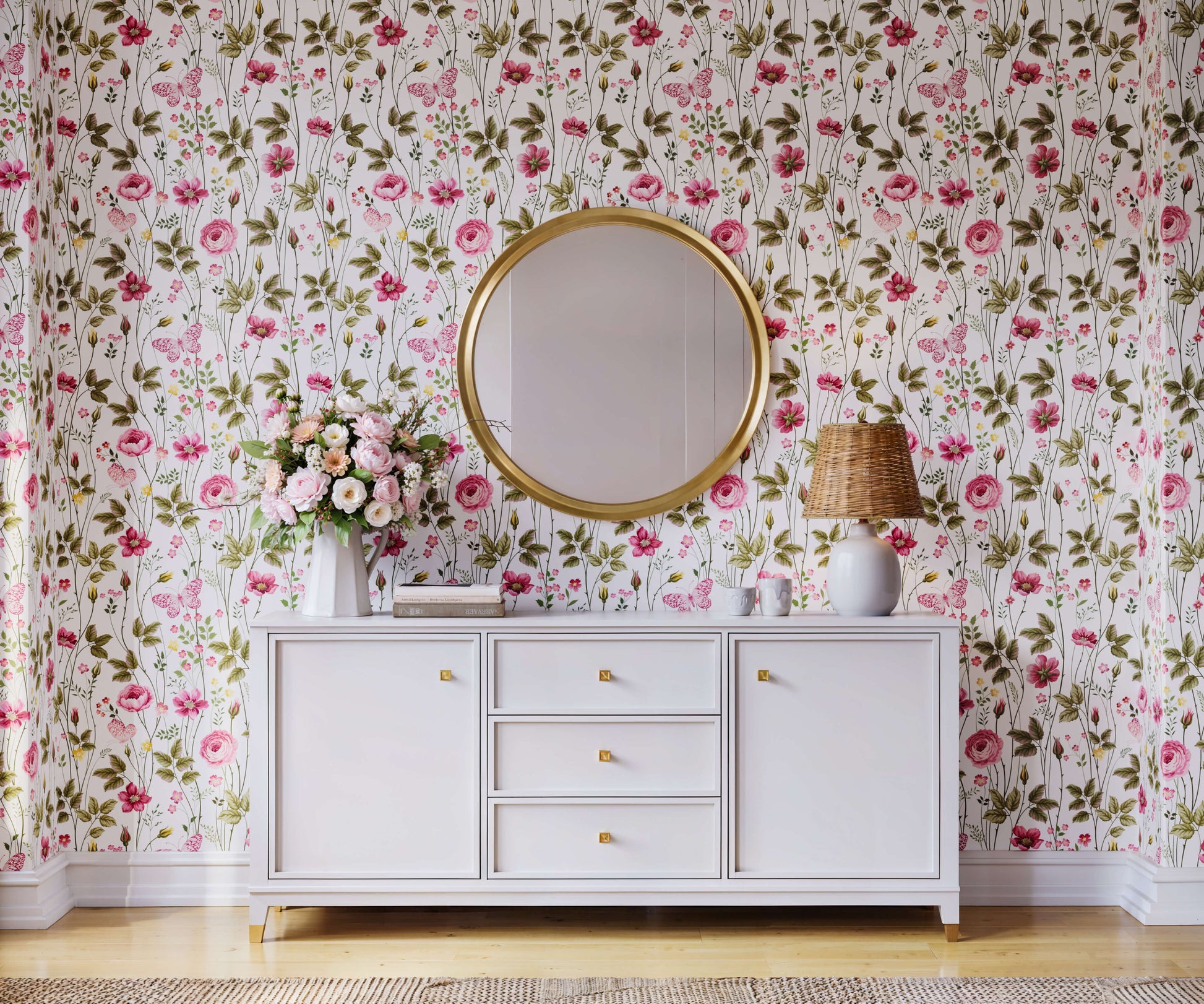This beautiful pink rose wallpaper cleverly balances as vintage look with a modern, romantic style. The floral design is inspired by traditional English heritage design, but it can also work well in soft, feminine, modern interior design schemes.