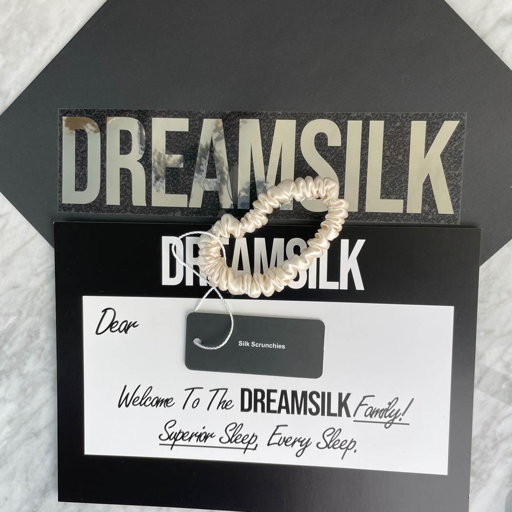 DREAMSILK's™ silk scrunchies that glide over your hair like moonlight over water.