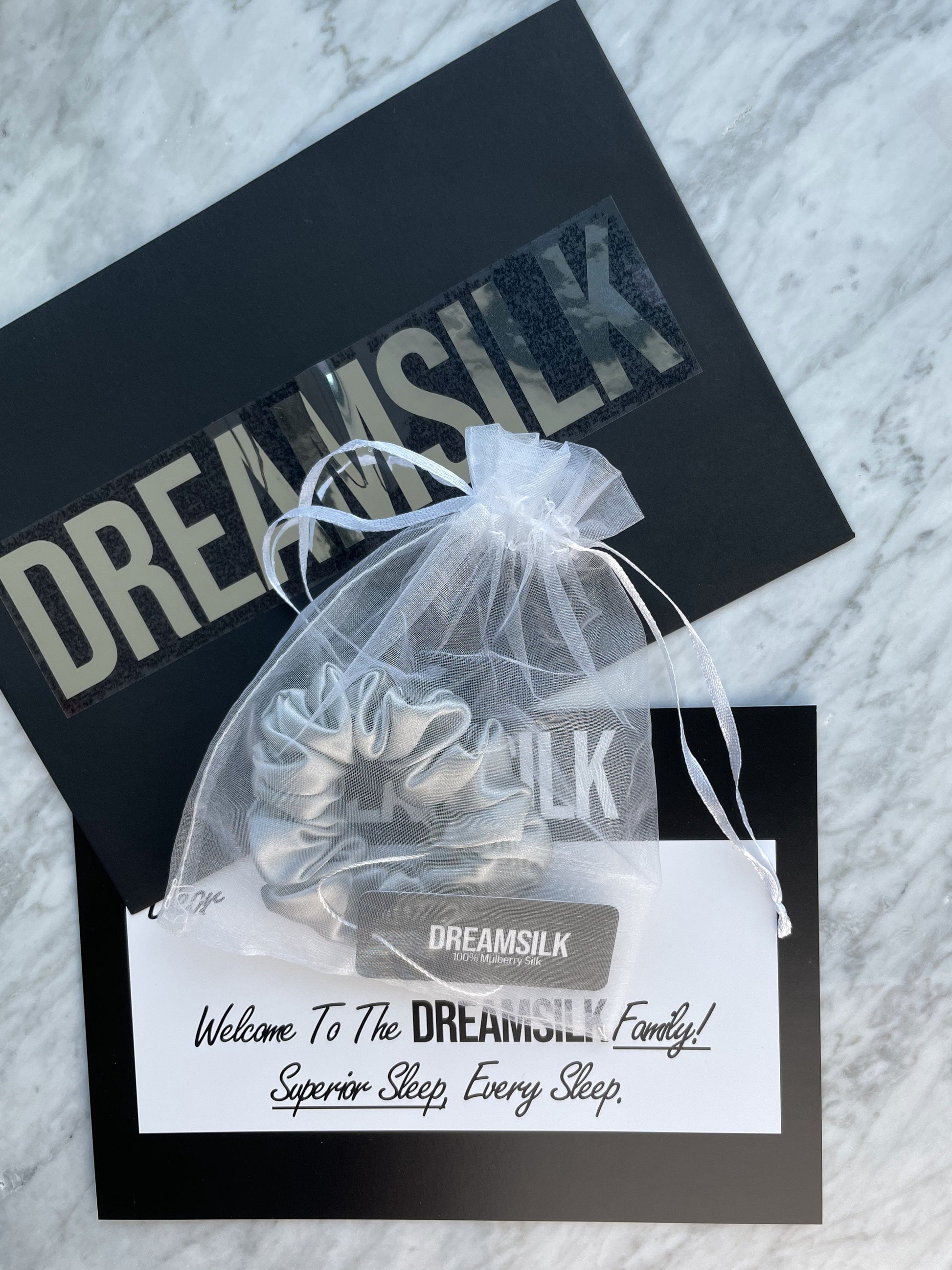 DREAMSILK's™ silk scrunchies that glide over your hair like moonlight over water.