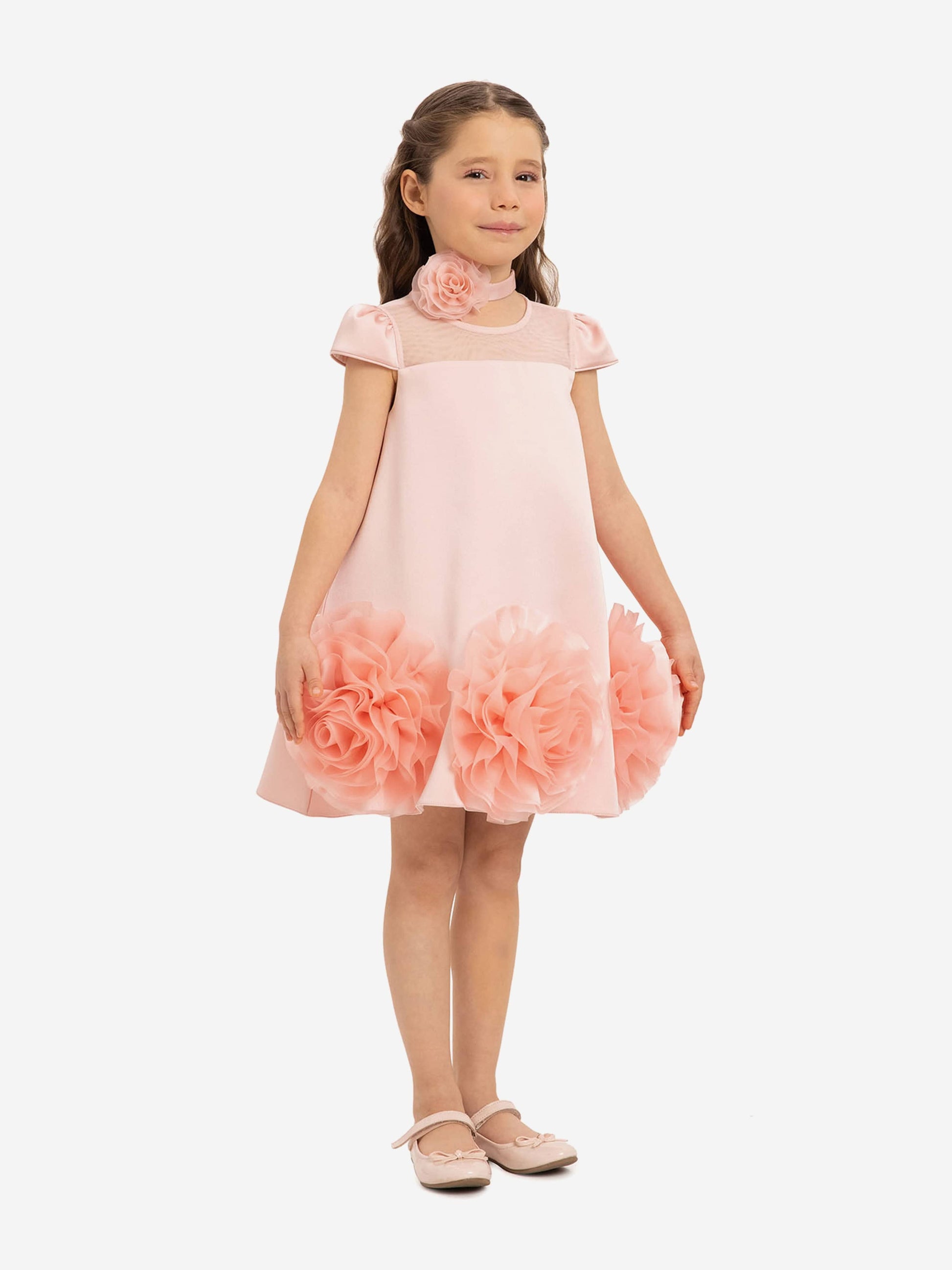 Dress & Fleur sport regal abstracts with an innovative twist. This girls pink dress offers a luxurious feel and an elegant silhouette. Woven from a soft satin fabric, it has a mesh yoke and large 3D flower appliqués at the hem.