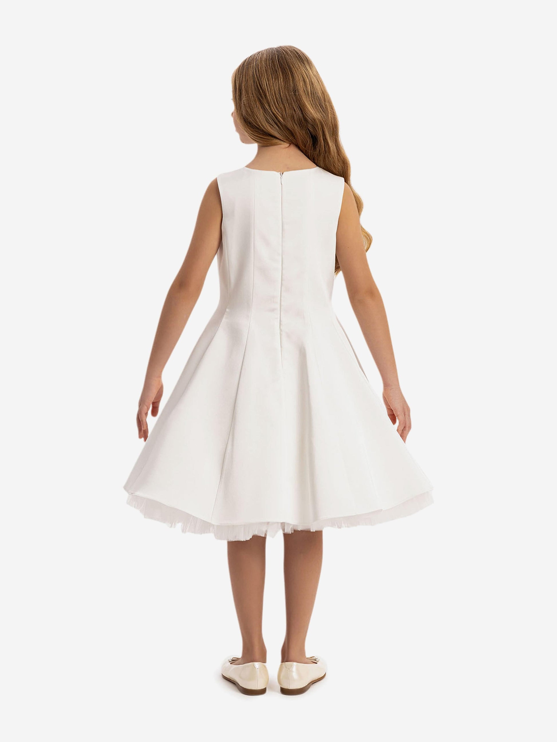 Dress & Fleur sport regal abstracts with an innovative twist. This girls dress is a clean, tailored design with a flared skirt and a soft tulle hem. There are floral appliqués on the shoulders and ethereal tulle draping.