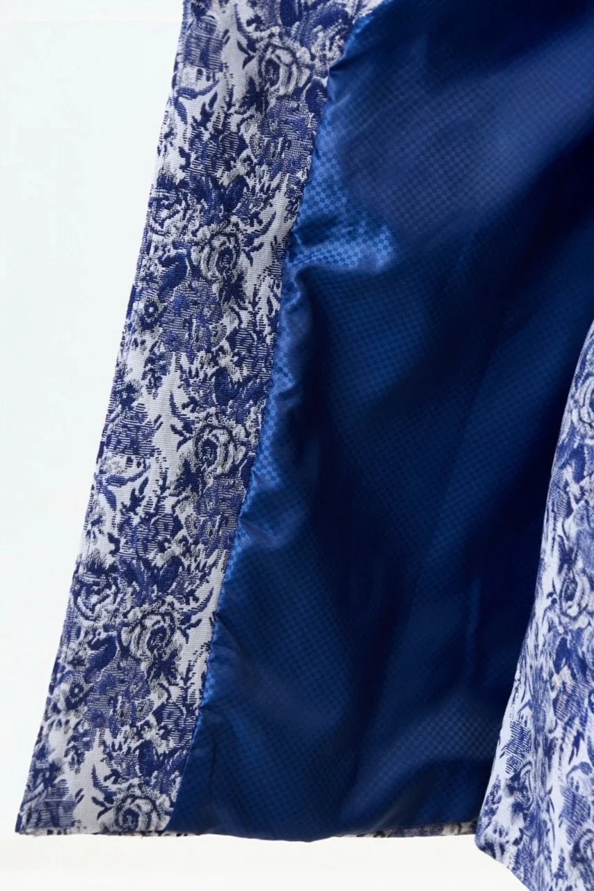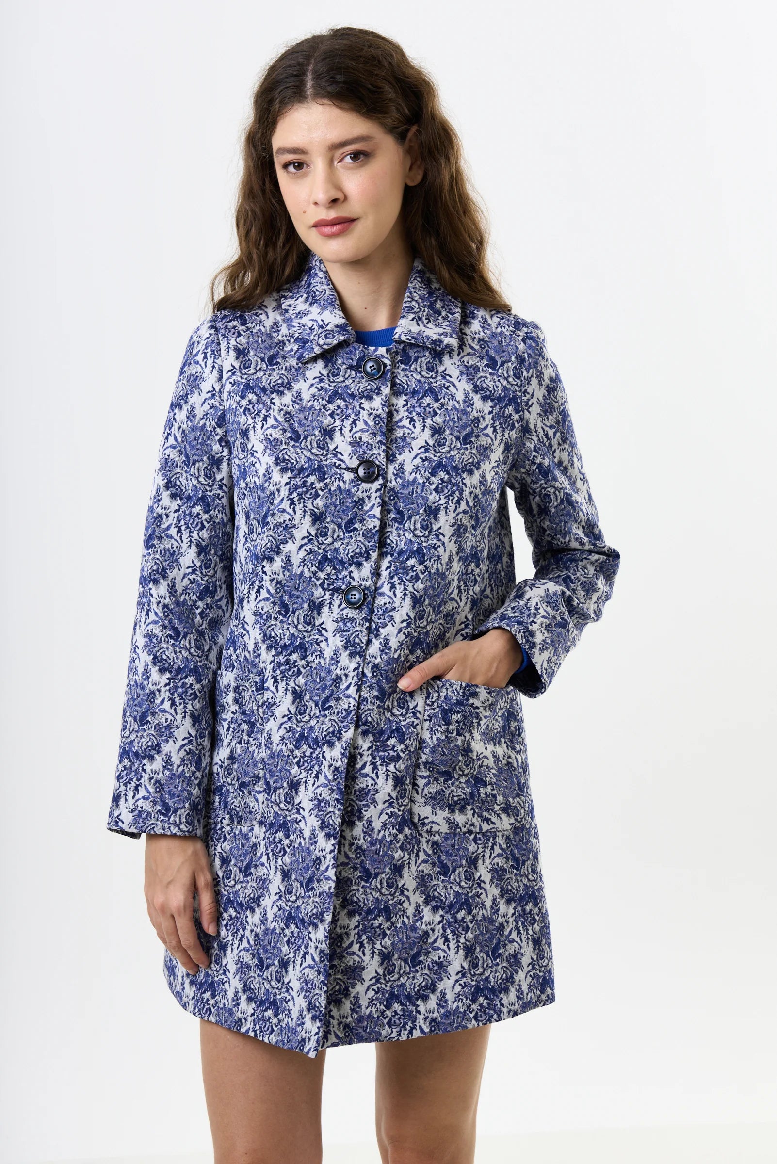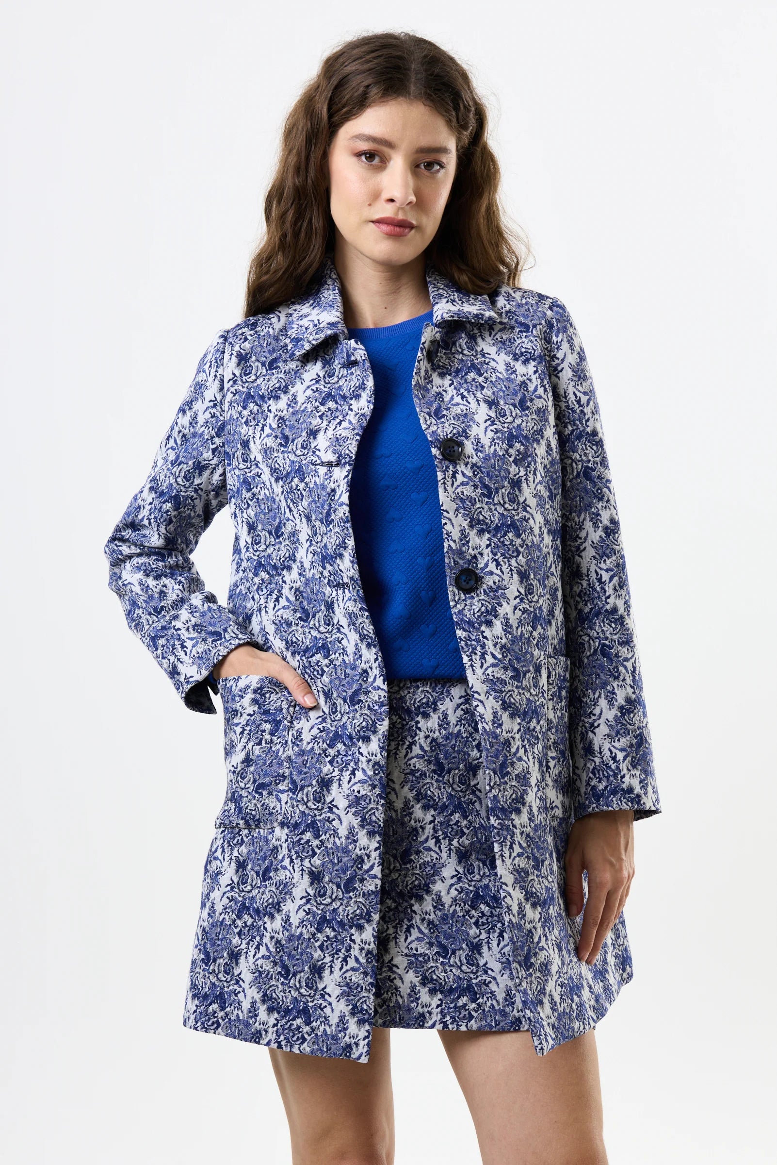 The Dryden Wedgewood Jacquard coat. Crafted from a navy and white jacquard, it's design taking inspiration from Wedgwood china this A-line short coat features a premium acetate shot lining, as well as two big patch pockets for added function and style. Look no further for a coat that can be worn casually with denim or dressed up for that special occasion.