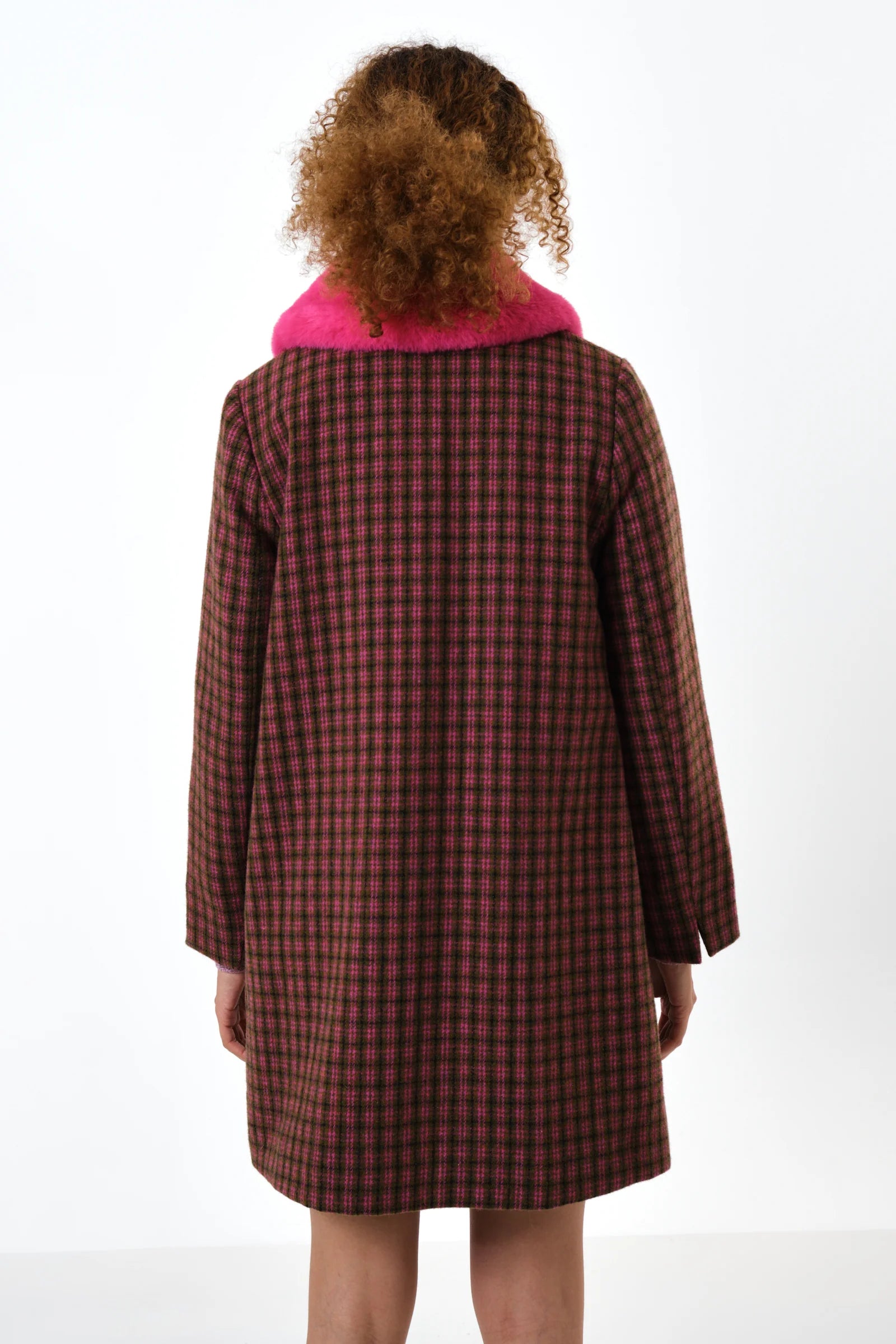 We're loving the Dryden Wyoming deep pink check coat. This wool-rich A-line short coat features a premium acetate pink shot lining, as well as two big patch pockets for added function and style and a super soft bright pink faux fur collar. The perfect coat for those wintery days ahead.