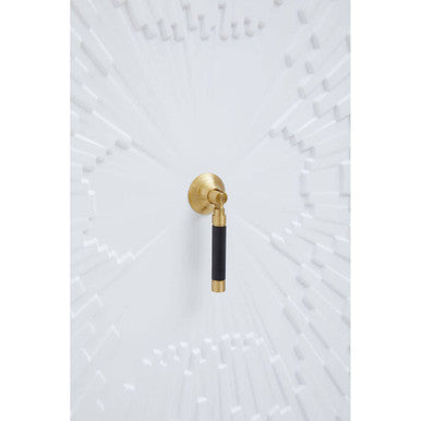 Add architectural presence and practical storage with the Dumas Black and White Two Door Cabinet. This black and white two door cabinet features subtly patterned doors that catch the light, while gold knobs and a coordinating gold base introduce a polished, gallery-inspired finish.