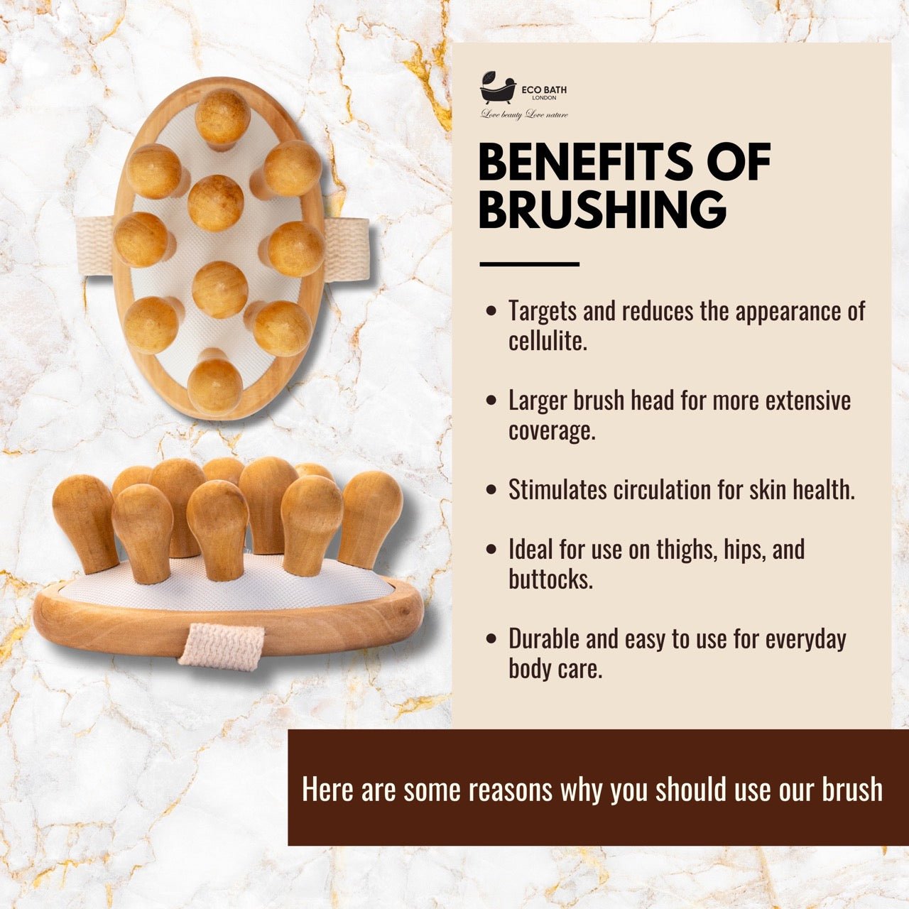 PORTABLE AND CONVENIENT: Compact and lightweight, the Eco Bath Cellulite Hand Brush Grand is perfect for use at home or on the go, allowing you to maintain your cellulite treatment routine wherever you are.