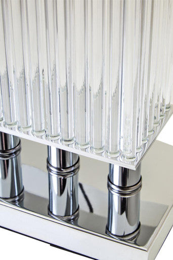 The Matte Silver Base Lamp combines sleek design with subtle glamour. A polished matte silver base supports transparent glass rods, creating a layered effect that feels both light and structured. Finished with a crisp ivory shade, this lamp introduces refinement to desks, consoles, and nightstands.