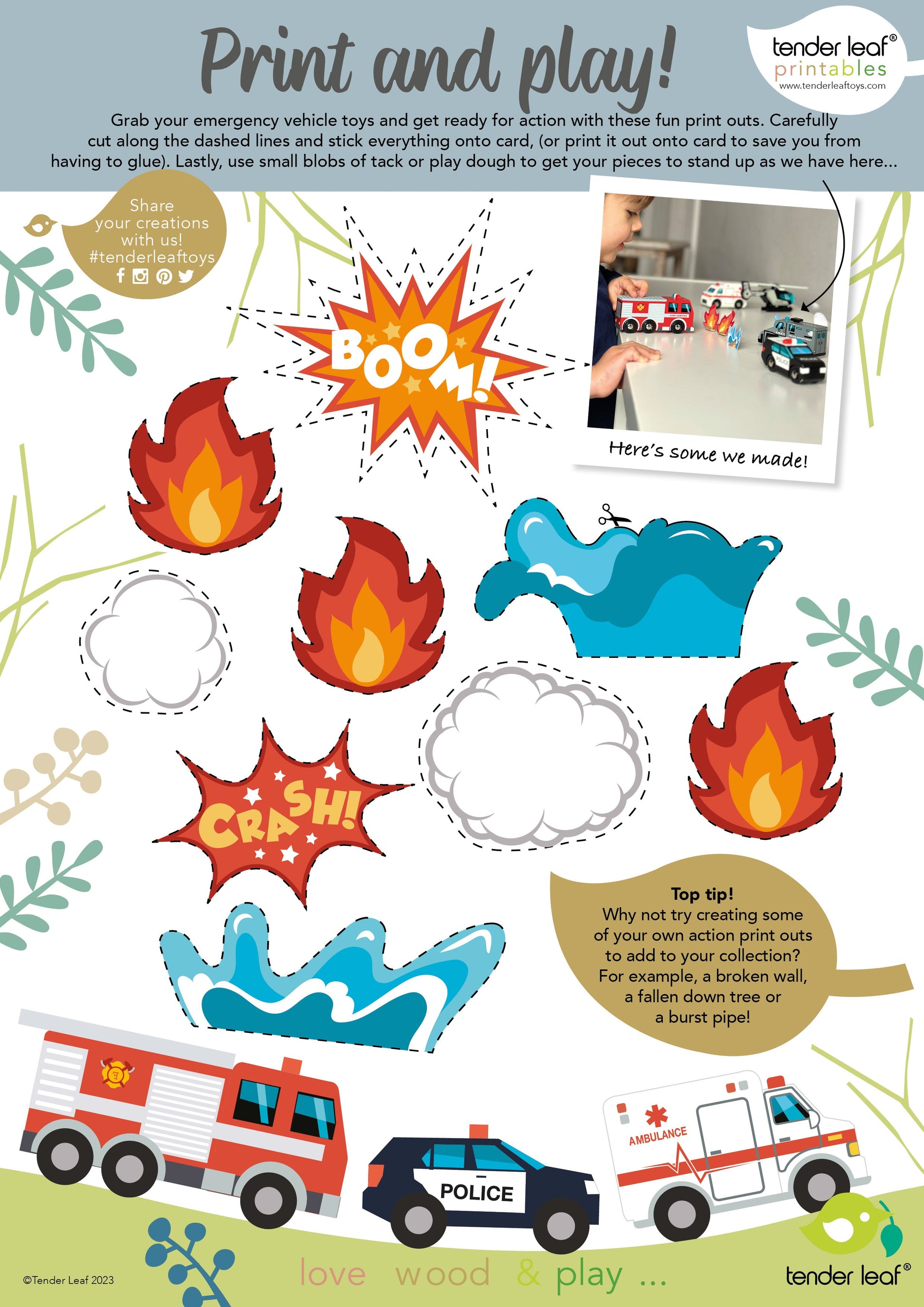 Solid wooden toy vehicles with standard wheel width that fits on all train tracks. Set includes; helicopter with rotating blades, ambulance, fire engine, police car, S.W.A.T car and lifeboat.