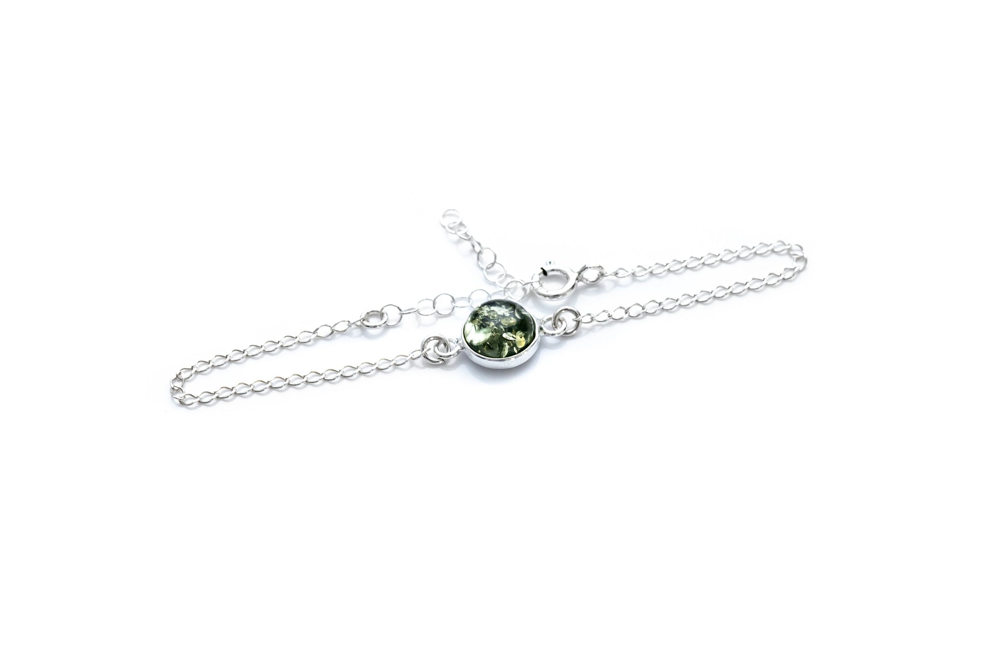 A beautiful Green Amber Bracelet featuring a 10mm, round Baltic Amber Stone set within a subtle sterling silver bezel. The Amber sits at the centre of a link chain bracelet, fully adjustable up to 200mm.