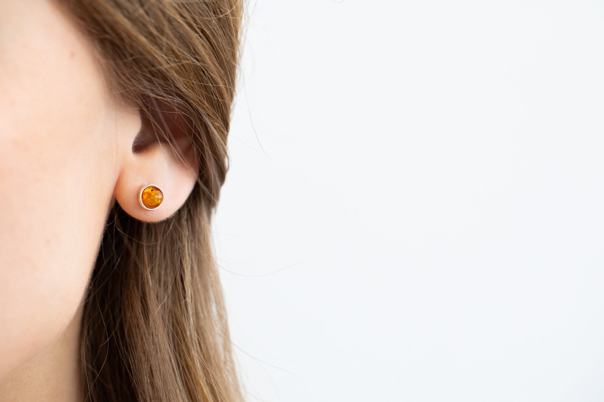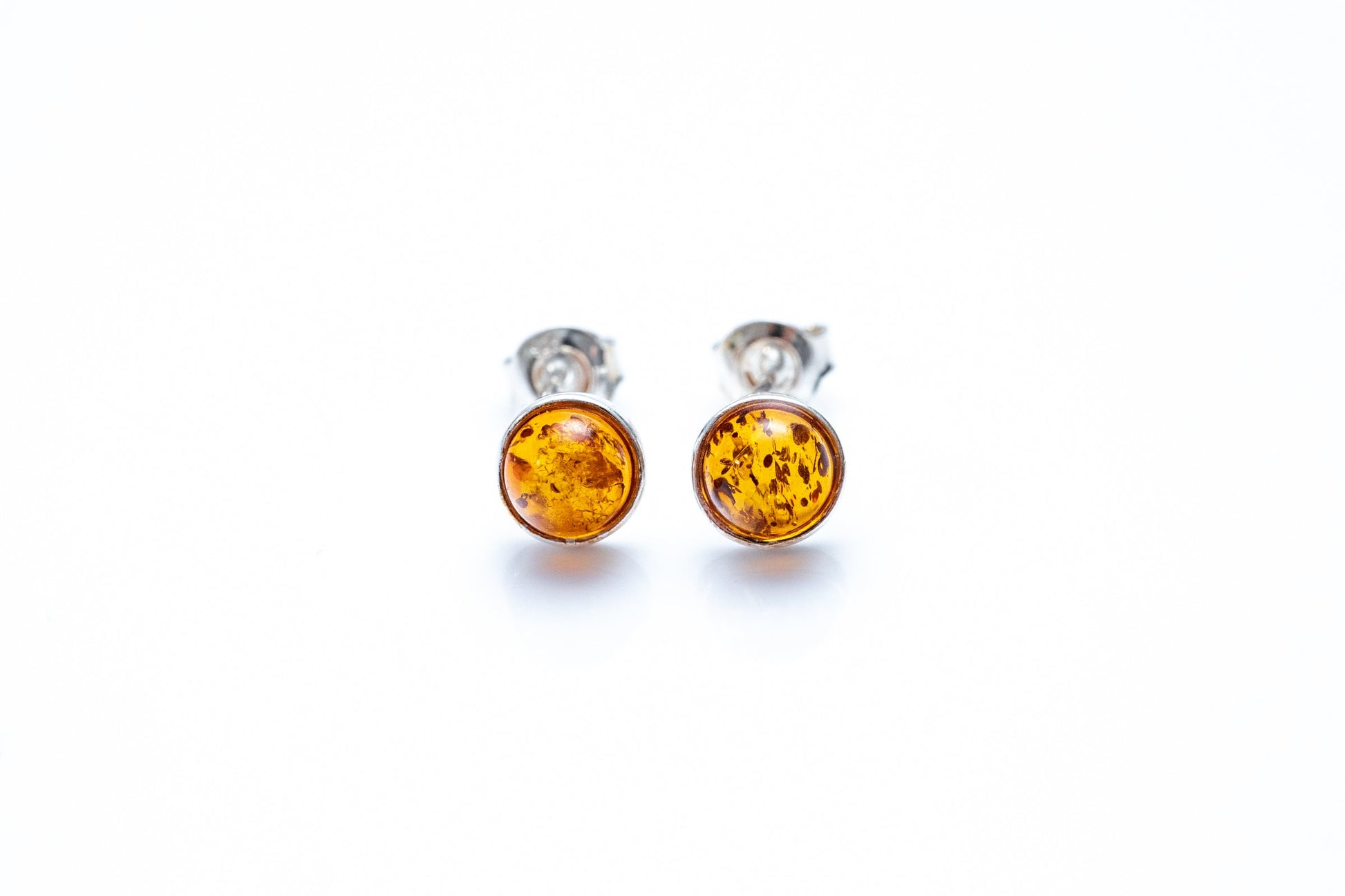 A beautiful pair of Amber Stud Earrings featuring a 6mm, round Baltic Amber Stone set within a subtle sterling silver bezel.