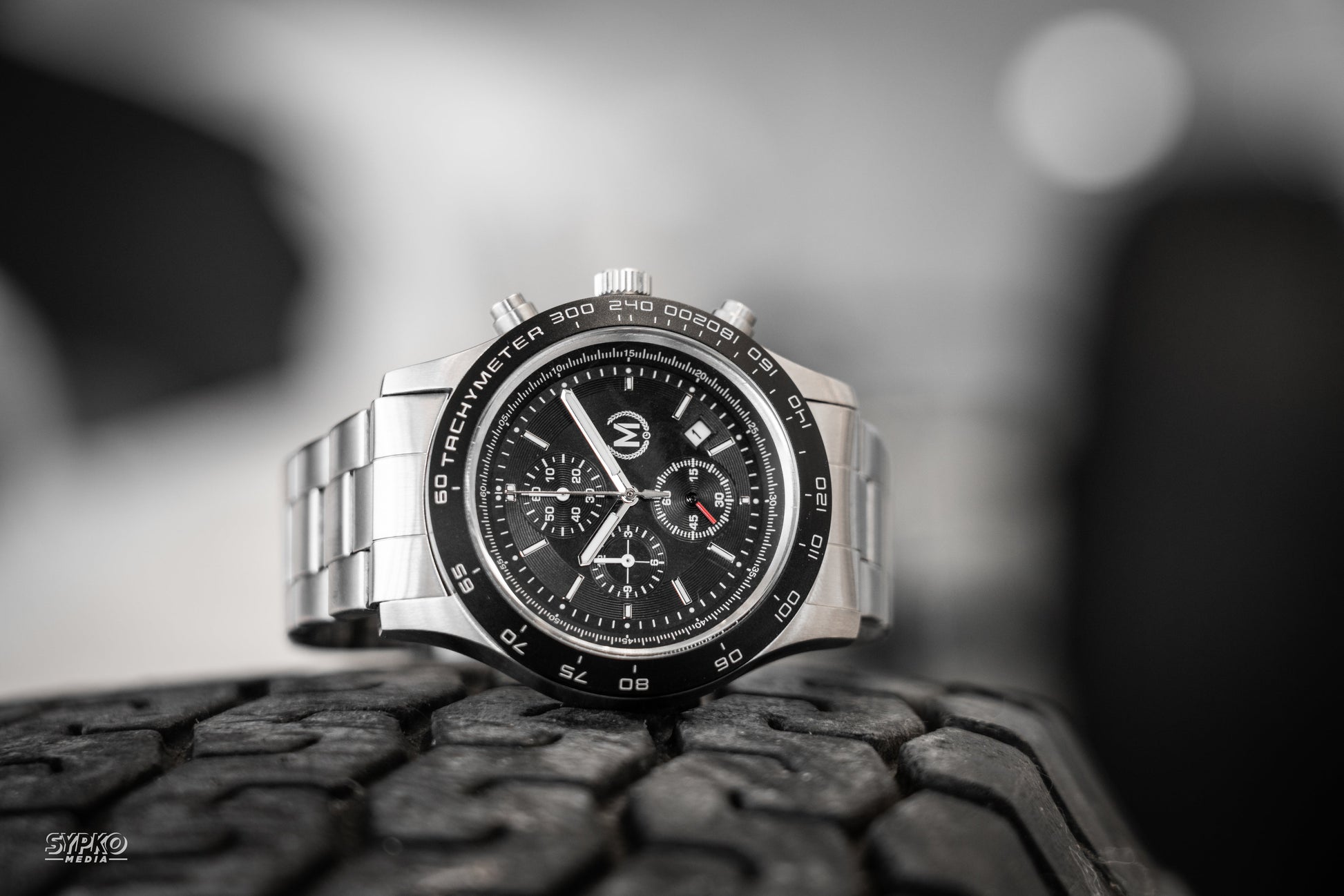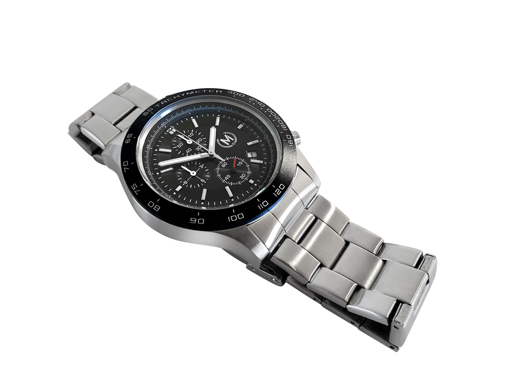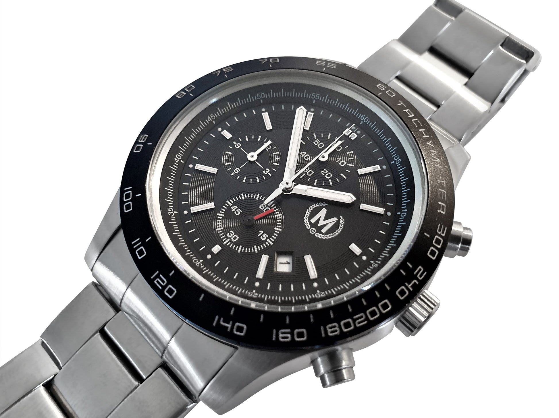 The Esses GT racing watch delivers sensations of tradition and modernity, its black steel-rimmed dial and bezel with tachymetre refers to GT cars of old and new with the added red subdial hand to add extra race essence. Elegant on the wrist this affordable racing chronograph embraces its owner with a beautiful brushed stainless steel strap giving a great weight to the watch when on the wrist. Who doesn't love racing watches?