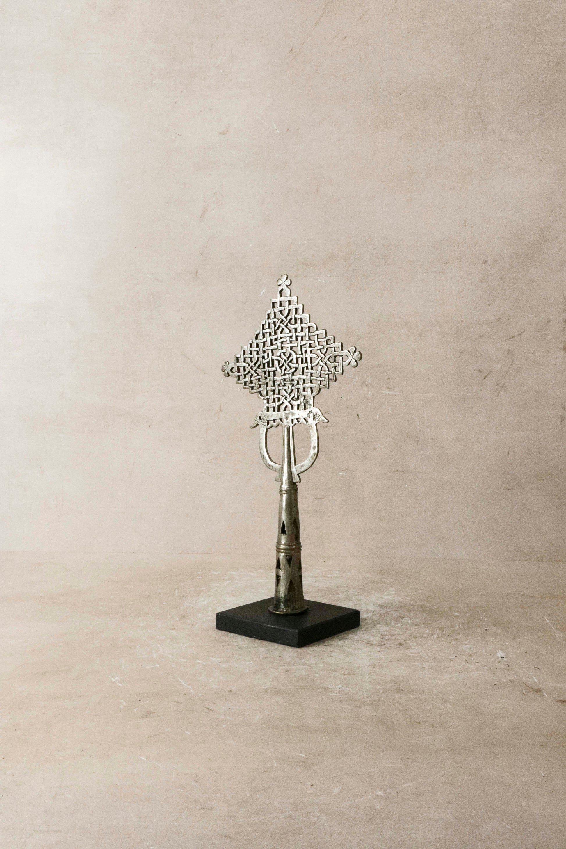 Ethiopia is home to one of the oldest continuous Christian traditions in the world, and Ethiopian silversmiths produce religious jewellery as an expression of that tradition. Star of David symbols are evident in design and emphasize the relationship of Christian Ethiopians to Israel, King Solomon and the Queen of Sheba. These individual Coptic crosses are cast and made in various styles, designs, and sizes. They can be hand-cut from various metal: silver, iron, gold, and brass--and cast using the lost wax method. Some Ethiopian crosses are made from wood, these ones are made of silver alloy. Designs are as varied as the regions they come from, and crosses are generally named after the towns or provinces where they are made. The use of these crosses is essentially religious. Crosses like these are known as processional crosses. They do have base and are carried during religious