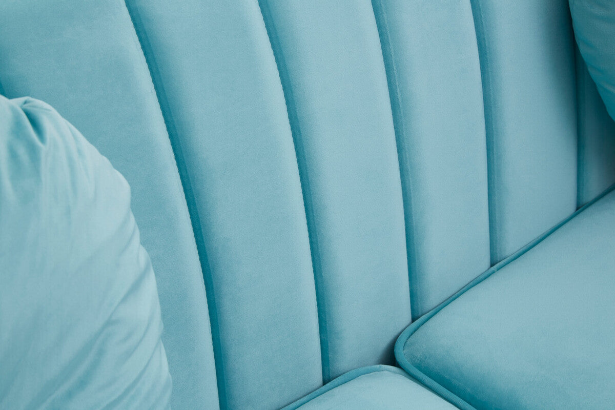 The Farah two seat pastel green velvet sofa has stitch detail on the backrest which complements its straight aesthetic. Balanced on black finish wooden legs, its pastel hued fabric creates a cool elegant luxurious feel.