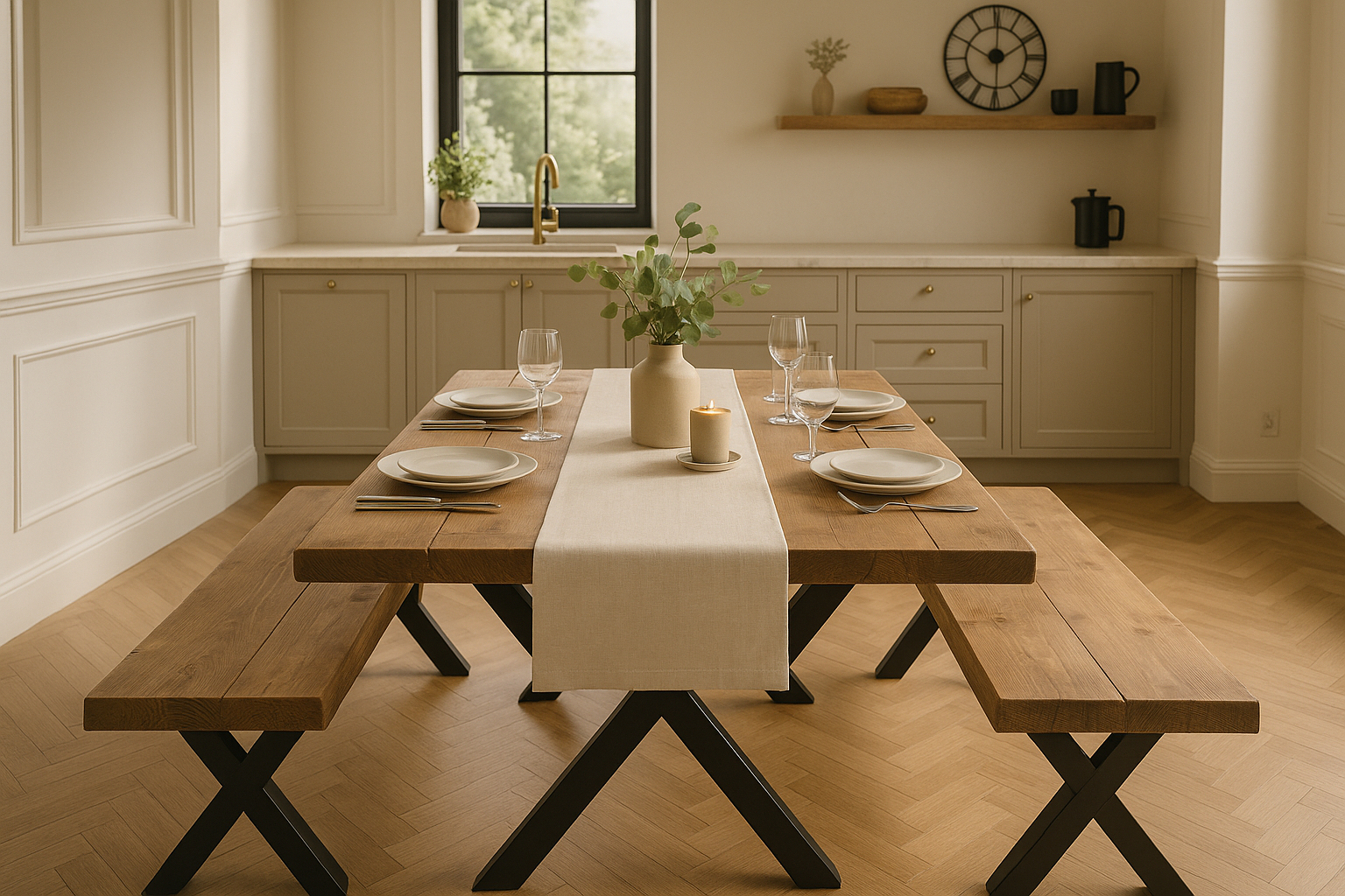Farmhouse Dining Table With Bench and Black Metal Cross Legs