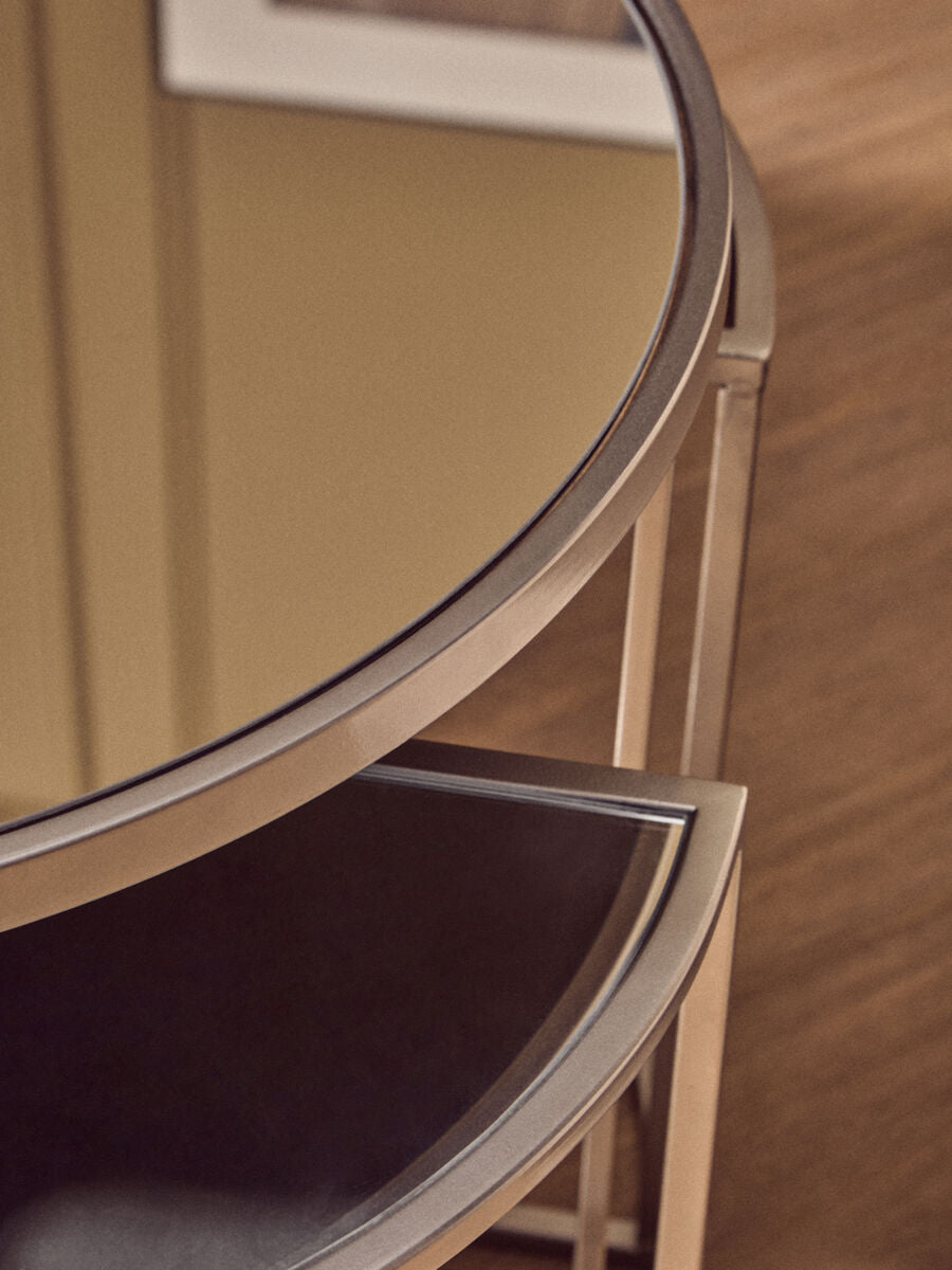 Ideal to maximise space, this set of five tables has a stackable design which brings style and function. Finished in metallic silver, four small triangular tables seamlessly glide under the round table to make an elegant focal point.