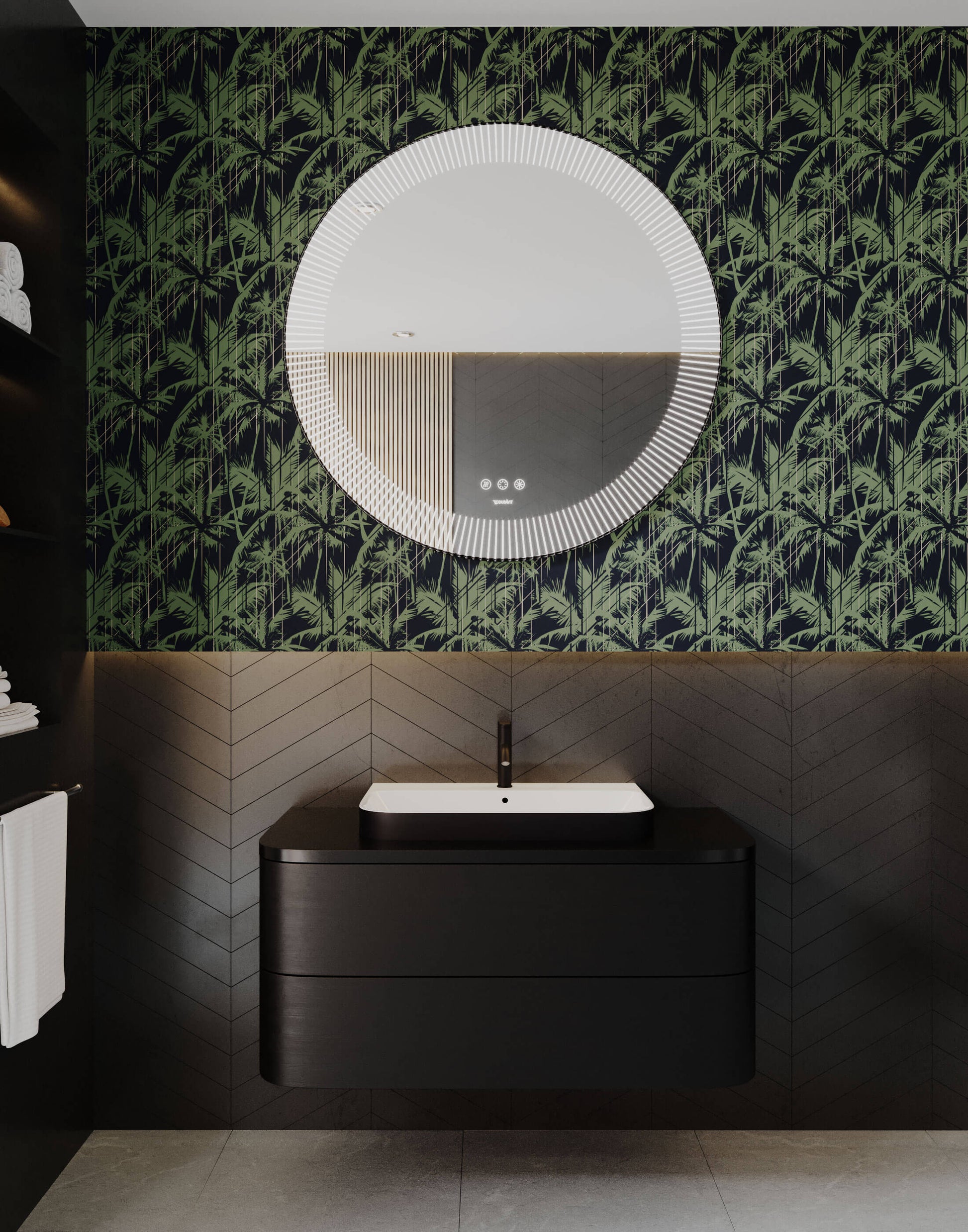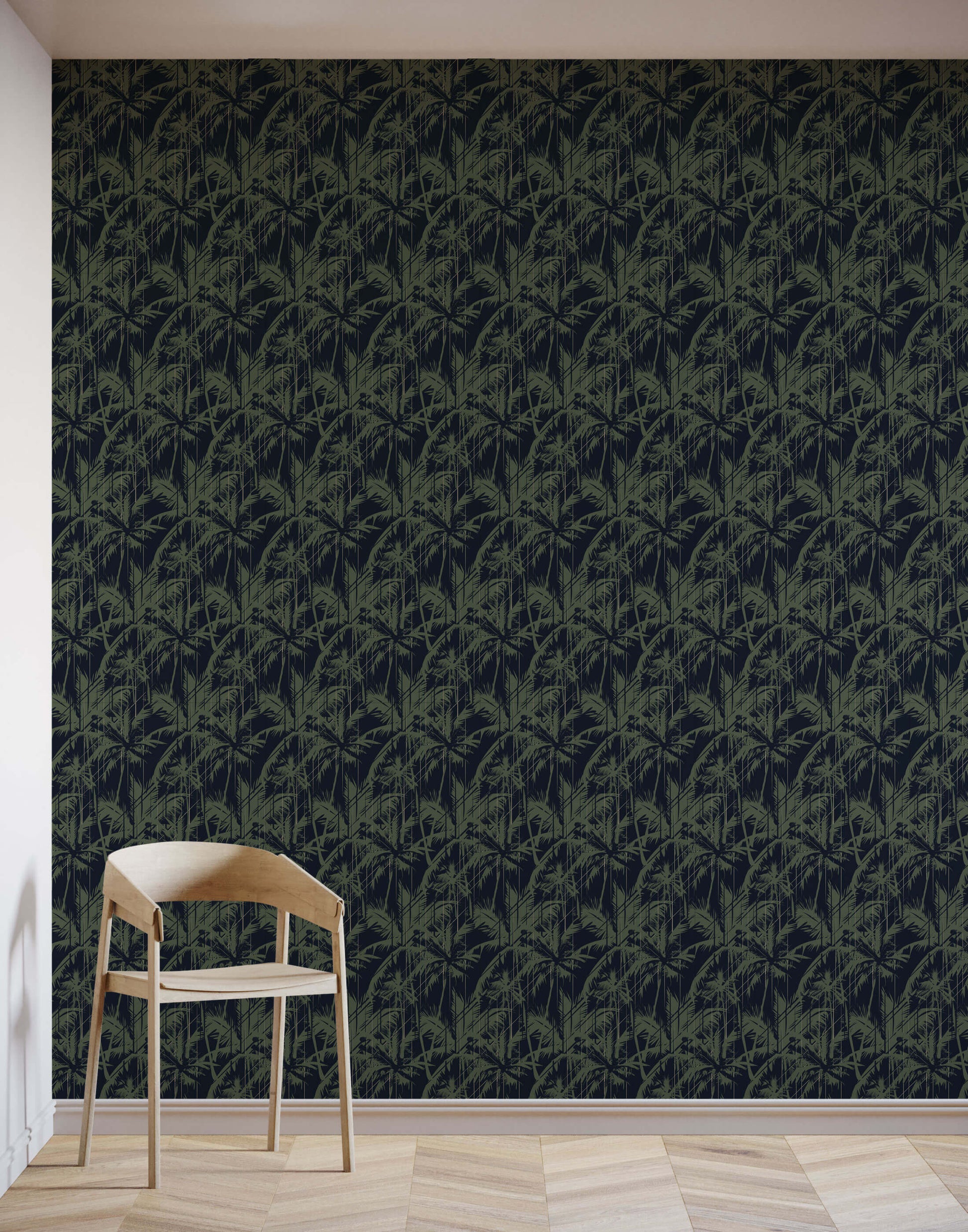 Get lost in this deep palm forest wallpaper, paired with moody tones to contrast with the bold pattern. This is a great choice if you're looking for a tree wallpaper with a twist.