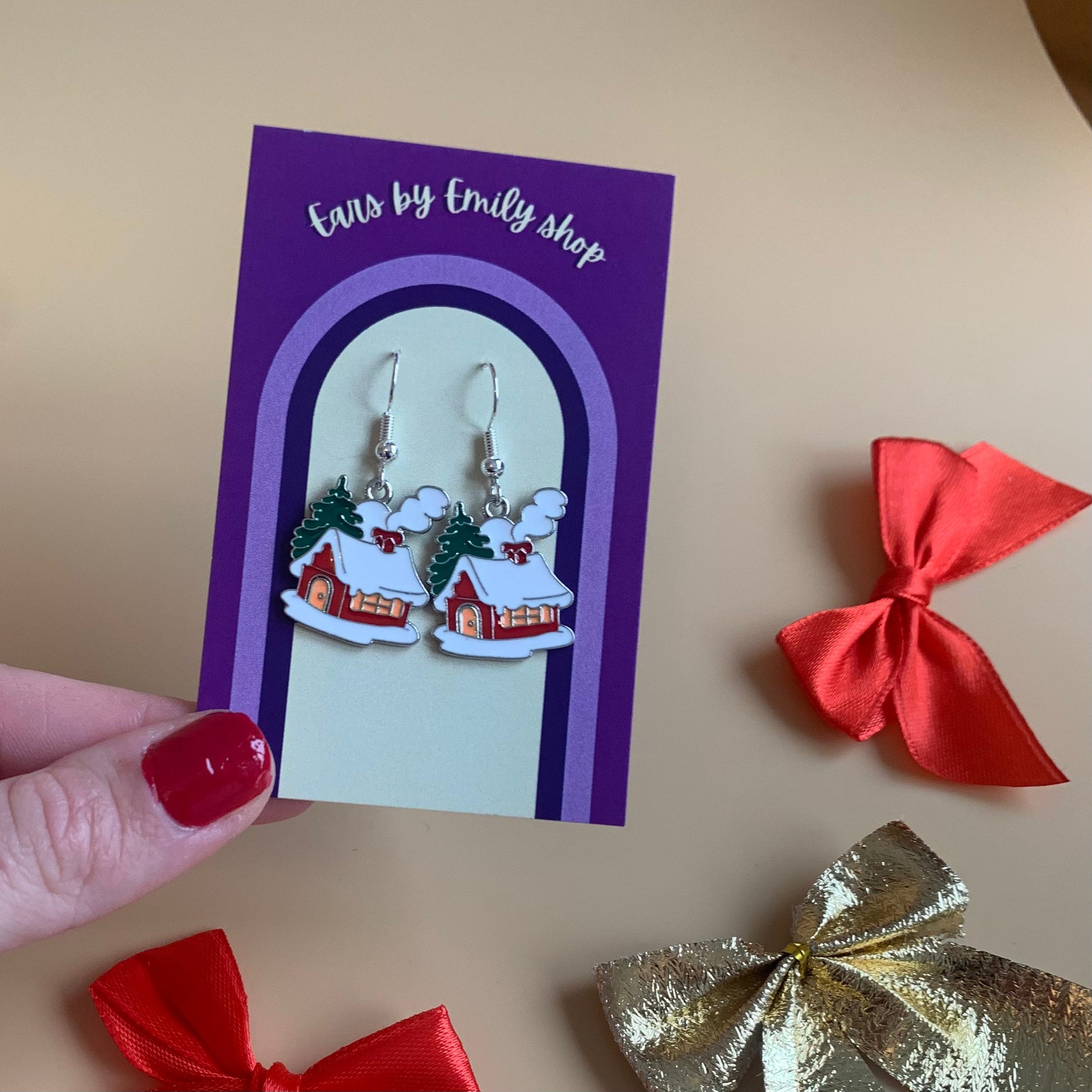 A festive pair of snowy house Christmas earrings on high quality silver plated brass hooks 🎄