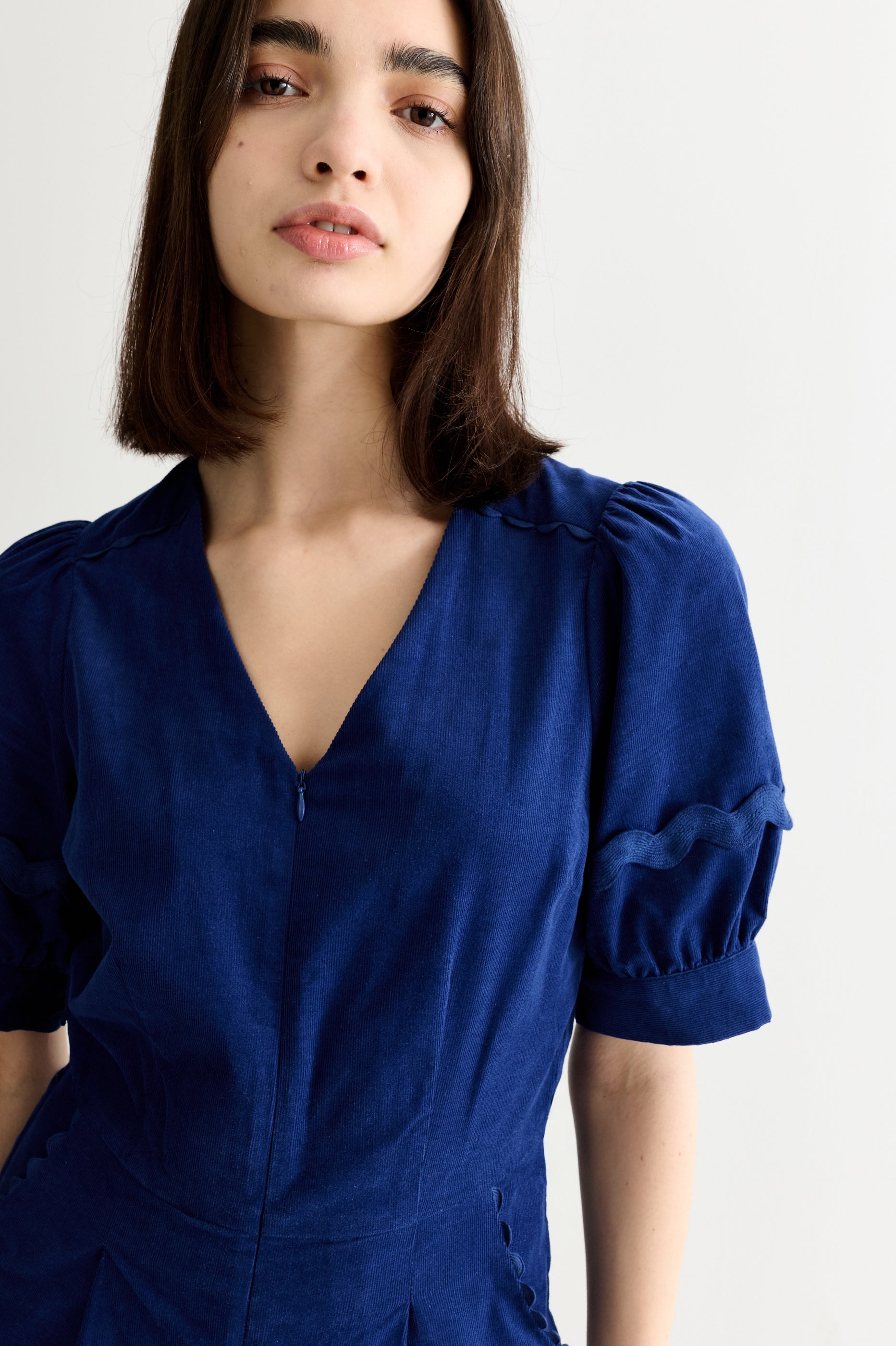 Find your perfect blend of work and play with the Finlay Babycord V-neck ric rac trim jumpsuit. Made from luxuriously soft navy cotton babycord, its flattering V-neck and eye-catching ric rac-trimmed statement sleeves bring a touch of fun to your professional look. Transition seamlessly from meetings to martinis with a jumpsuit designed to keep you comfortable and stylish all day long.