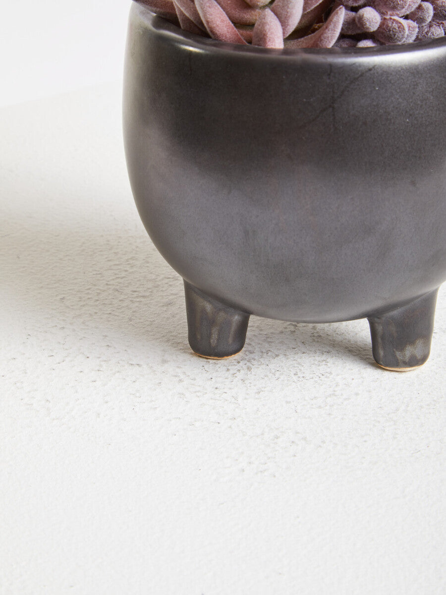 This southwestern inspired faux Fiori is ideal for farmhouse decor. The mixed succulents are arranged neatly in a small grey ceramic pot reflecting the aesthetics of rural architecture. The pot is elevated by three curved legs that offer stability and style to the grey pot. These succulents are well-suited for windowsill, living room tables, or mantel over the fireplace.
