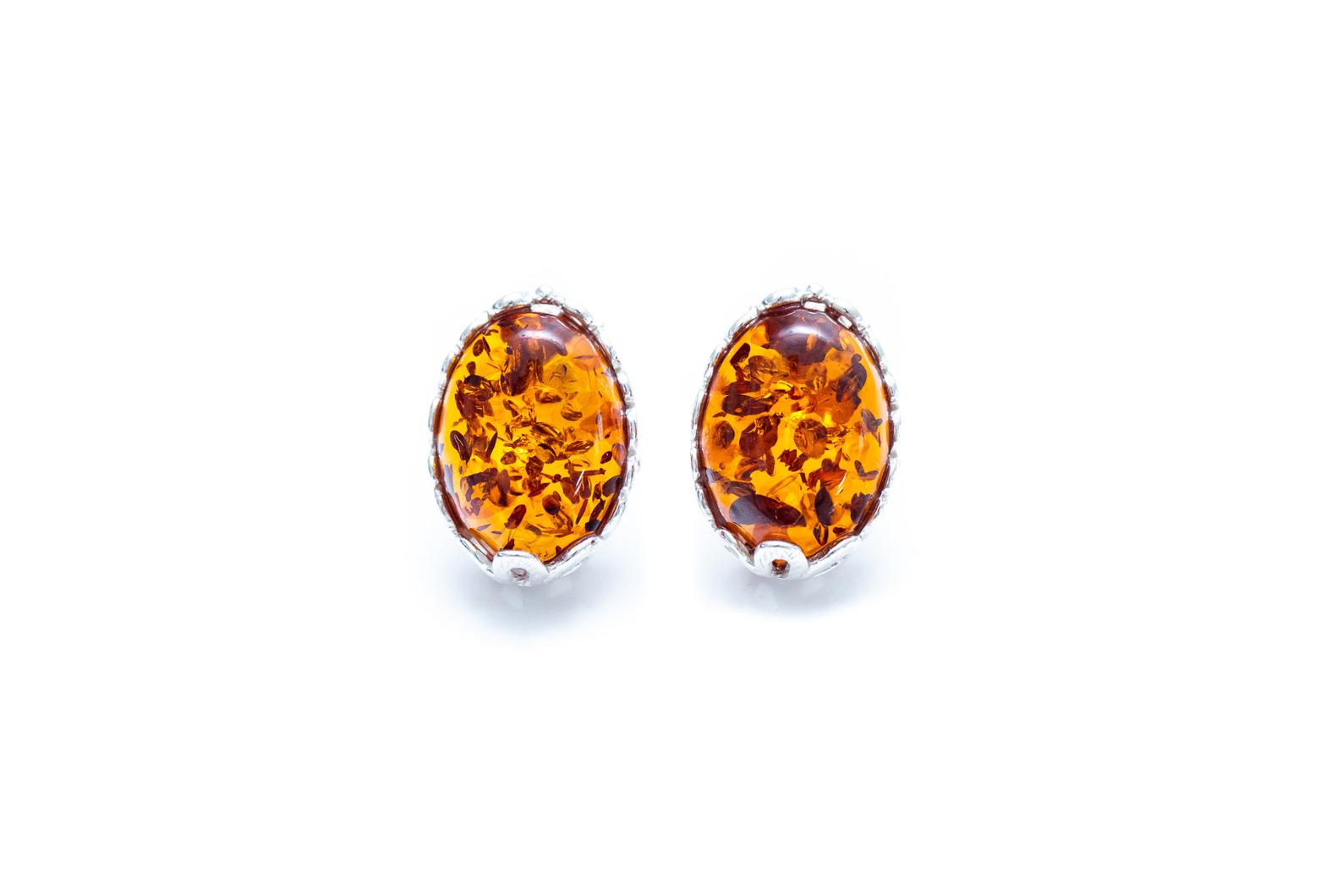 A dainty pair of Amber Stud Earrings. Featuring a modern floral setting, framing a radiant oval orange amber stone. A beautiful accessory for everyday to evening wear.