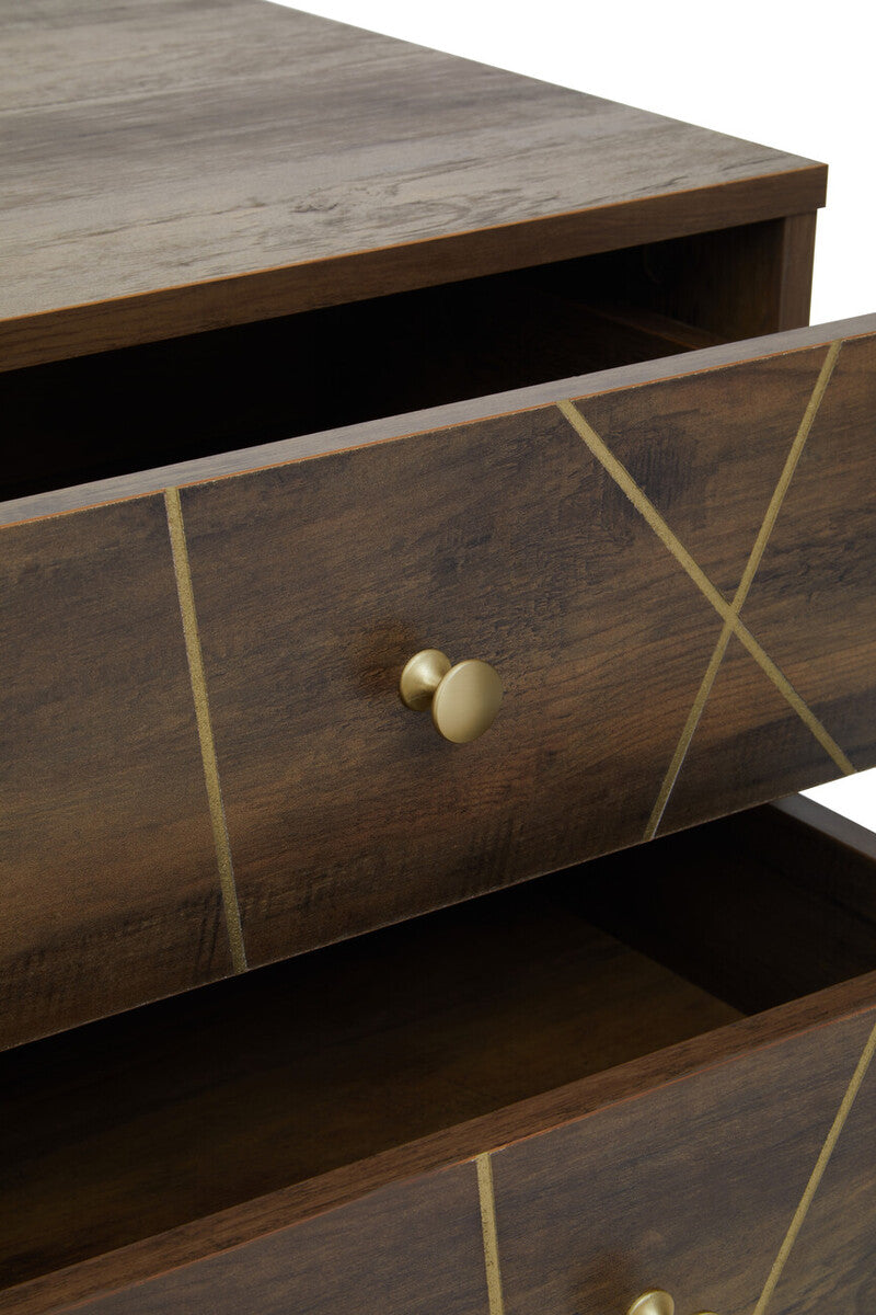 Standing atop sturdy hairpin metal legs in the warm metallic finish, this media unit boasts a wood veneering effect. The two drawers and shelving units of this media unit are capable of storing and showcasing necessary items.