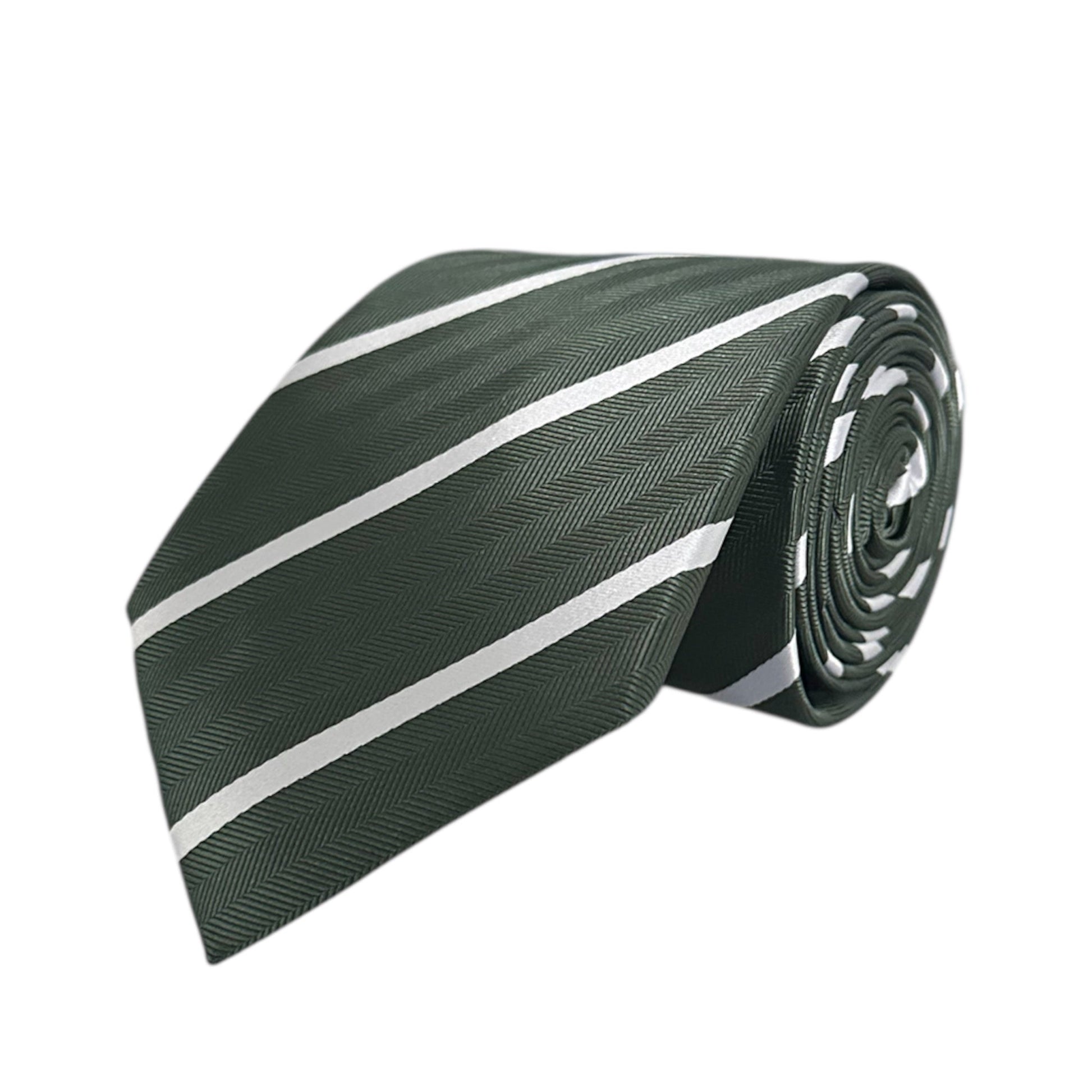This forest green herringbone tie features clean white single stripes for a fresh, classic finish.
