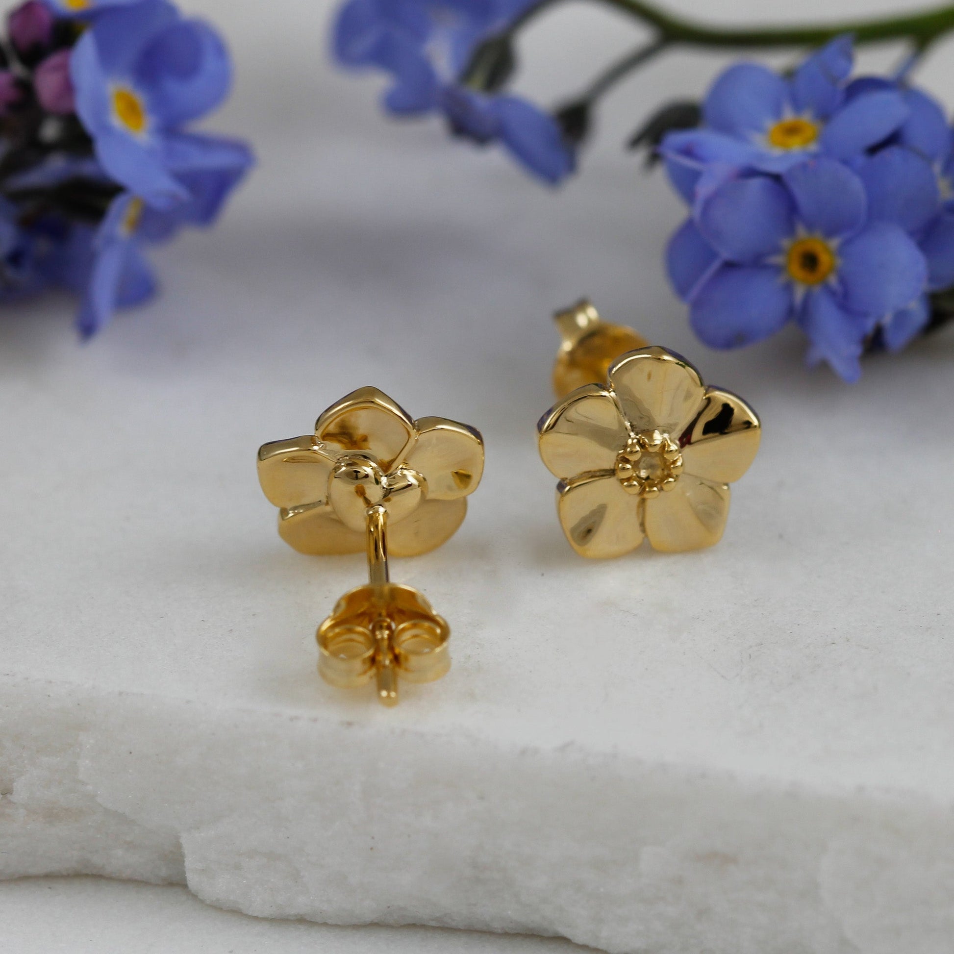 Expertly cast in solid sterling silver and plated with a thick 18ct gold vermeil, these pretty Forget-Me-Not stud earrings have a raised profile, making them as high quality as they are timeless and meaningful in their design.