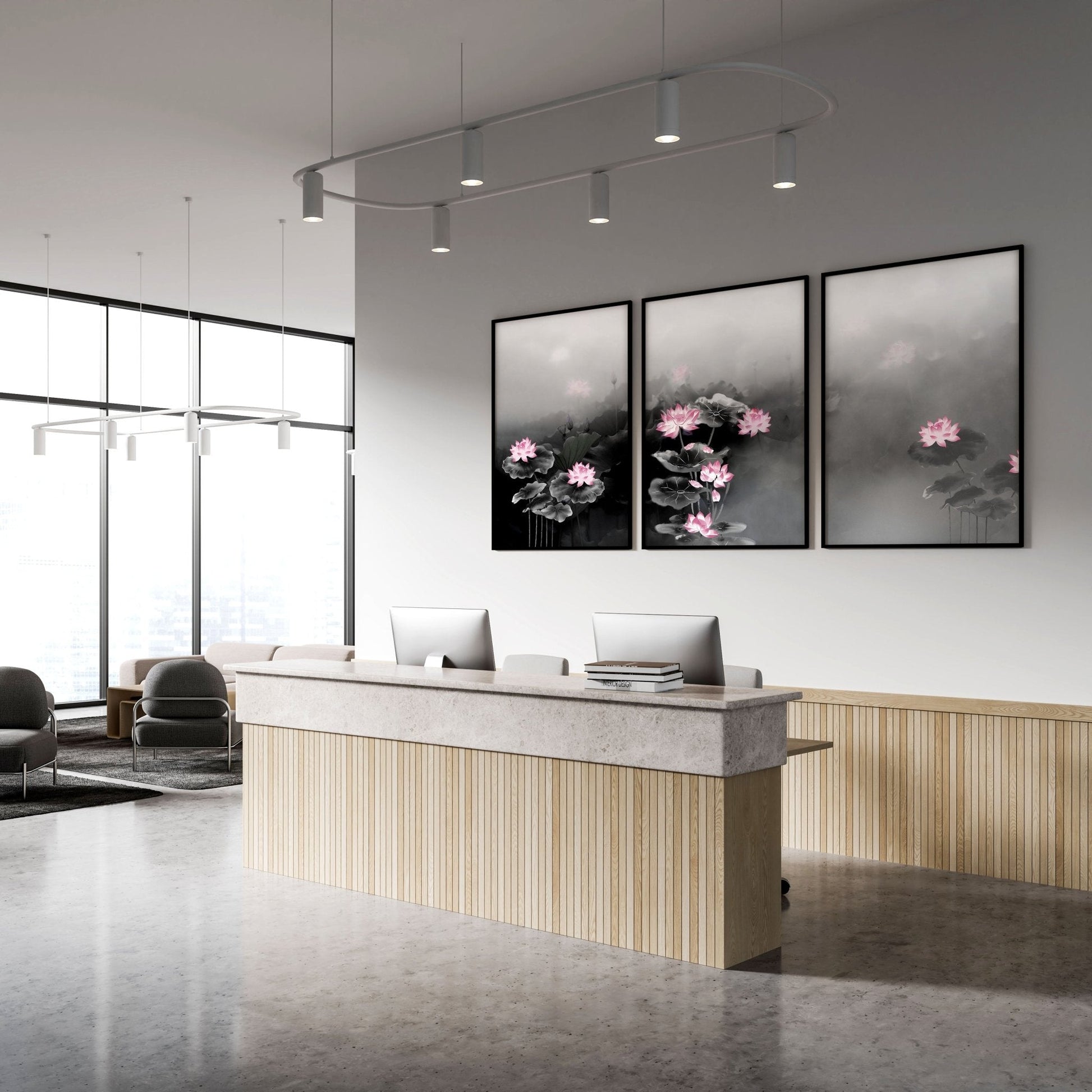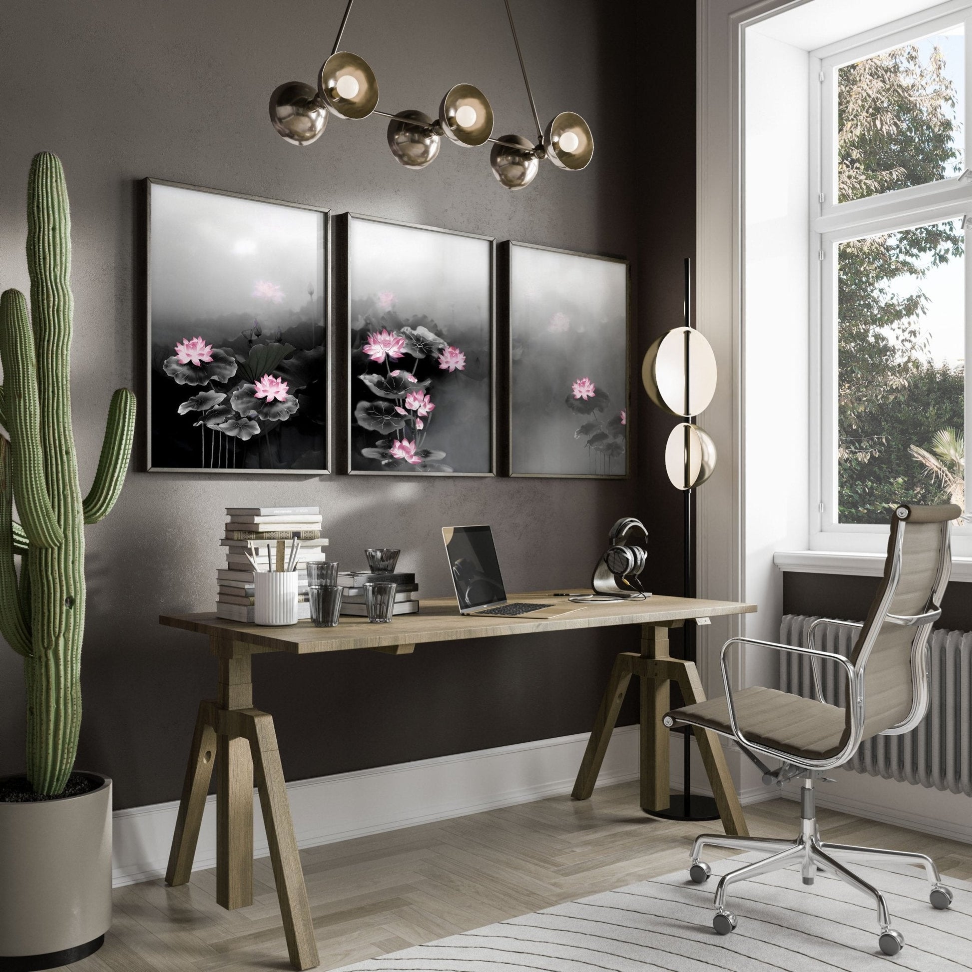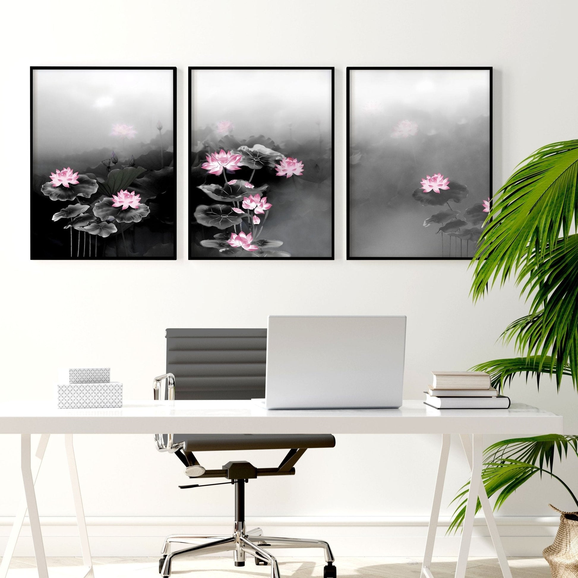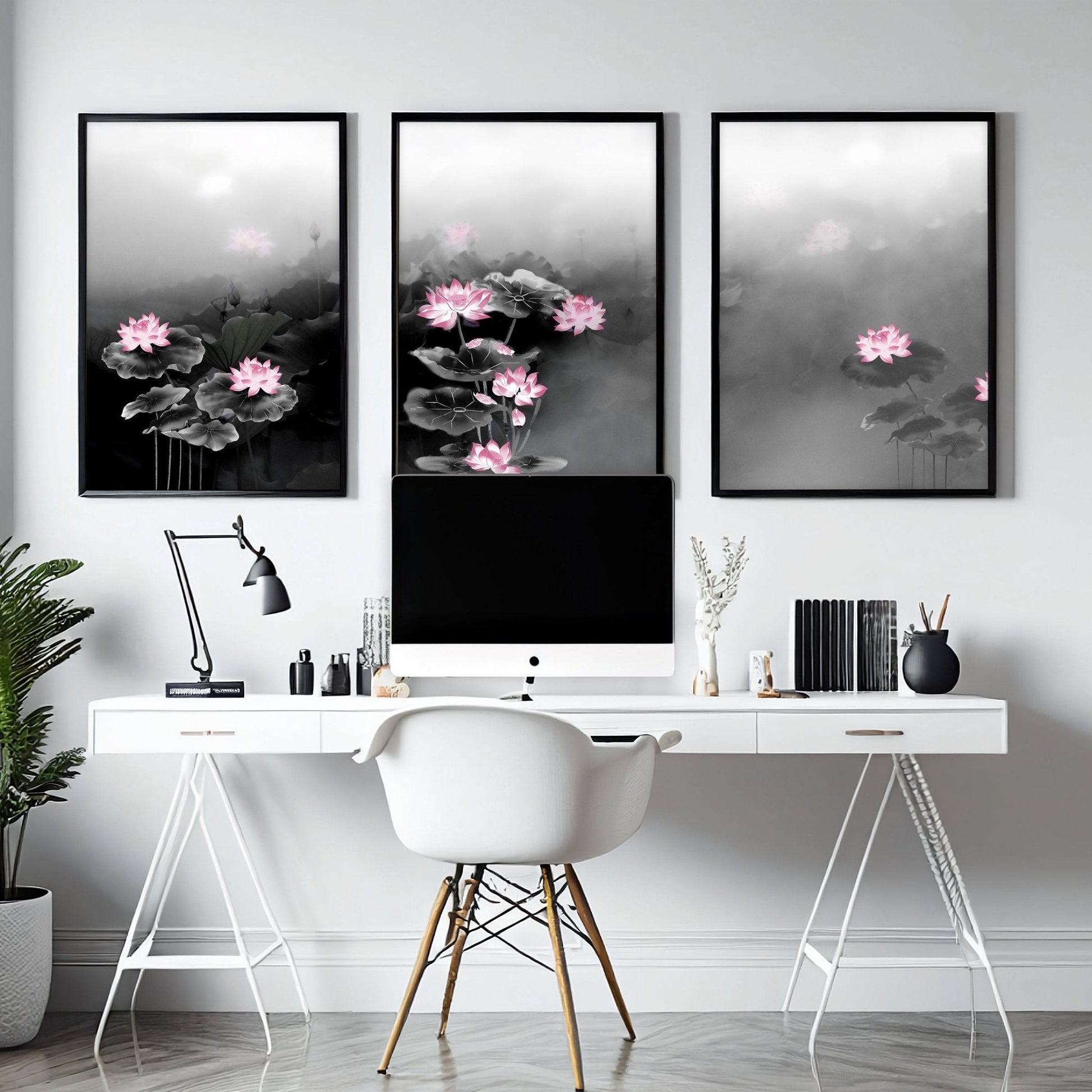 These Asian-influenced designs feature intricate details and harmonious balance, inviting a sense of cultural richness into any space. Picture these prints enhancing your walls, offering a serene escape and elegant focal point in your office. The monochromatic style works effortlessly with various colour schemes, making it a versatile choice for enhancing modern or traditional decor styles.