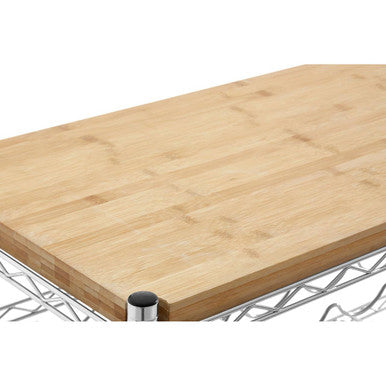 This wine rack is crafted from strong metal with a shiny chrome coating, providing durability and a modern look. The top is made of renewable, lightly grained bamboo, adding an eco-friendly touch. Protective black feet prevent damage to floors, making it both stylish and practical for wine storage.