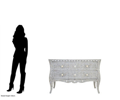 Each drawer offers generous storage for clothes, linens, or accessories, gliding smoothly to make everyday organisation a pleasure. The neutral palette white, grey, and pearlescent highlights pairs easily with calm bedrooms, light living rooms, or serene hallways. Built on a stable MDF and resin substrate, the inlay work remains protected for long-term enjoyment.
