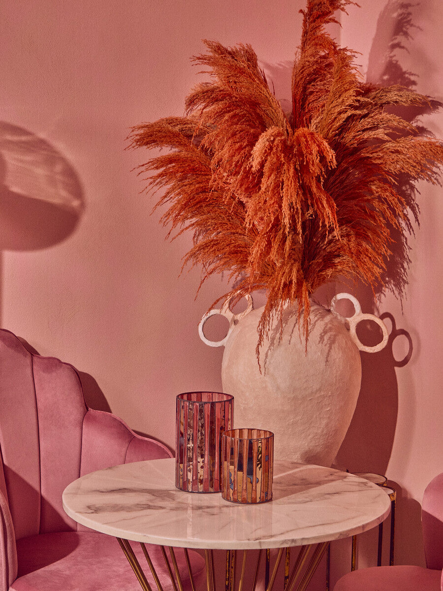 This elegantly designed large candle holder is made from glass and feature a unique blend of pink tone across its round body. The mosaic patterns contrast with the clean straight lines creating a glimmering accent piece ideal for contemporary living spaces. Light a candle in this glass holder and let it brighten up your space with light glow gleaming throw the glass lines.