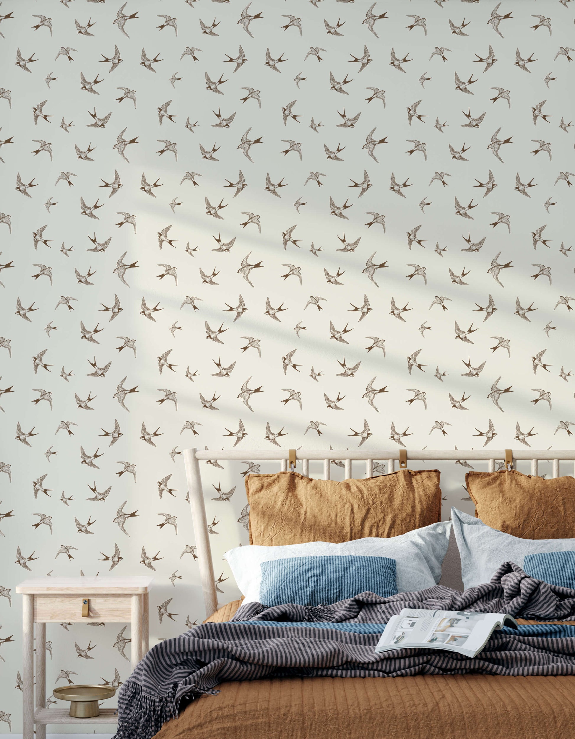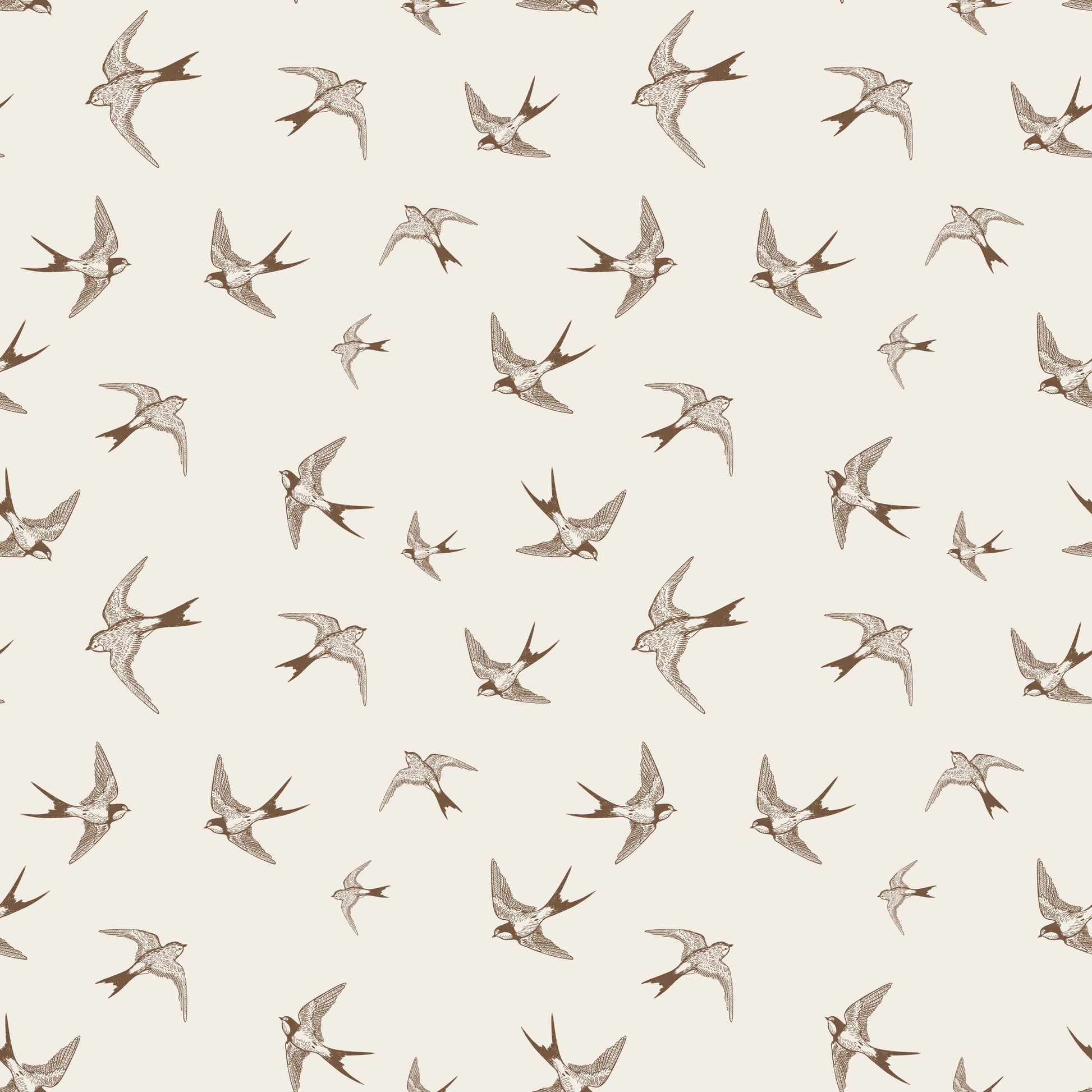 Our swallow wallpaper will have a charming and graceful impact on your design scheme. This elegant design features intricate depictions of swallows in flight in soft brown tones, creating a visually enchanting and serene atmosphere.