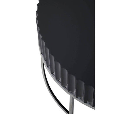 This coffee table features a flat top with fluted carvings around it in a grey finish. The decorative top forms a monochrome contrast with the open and airy polished stainless steel frame.