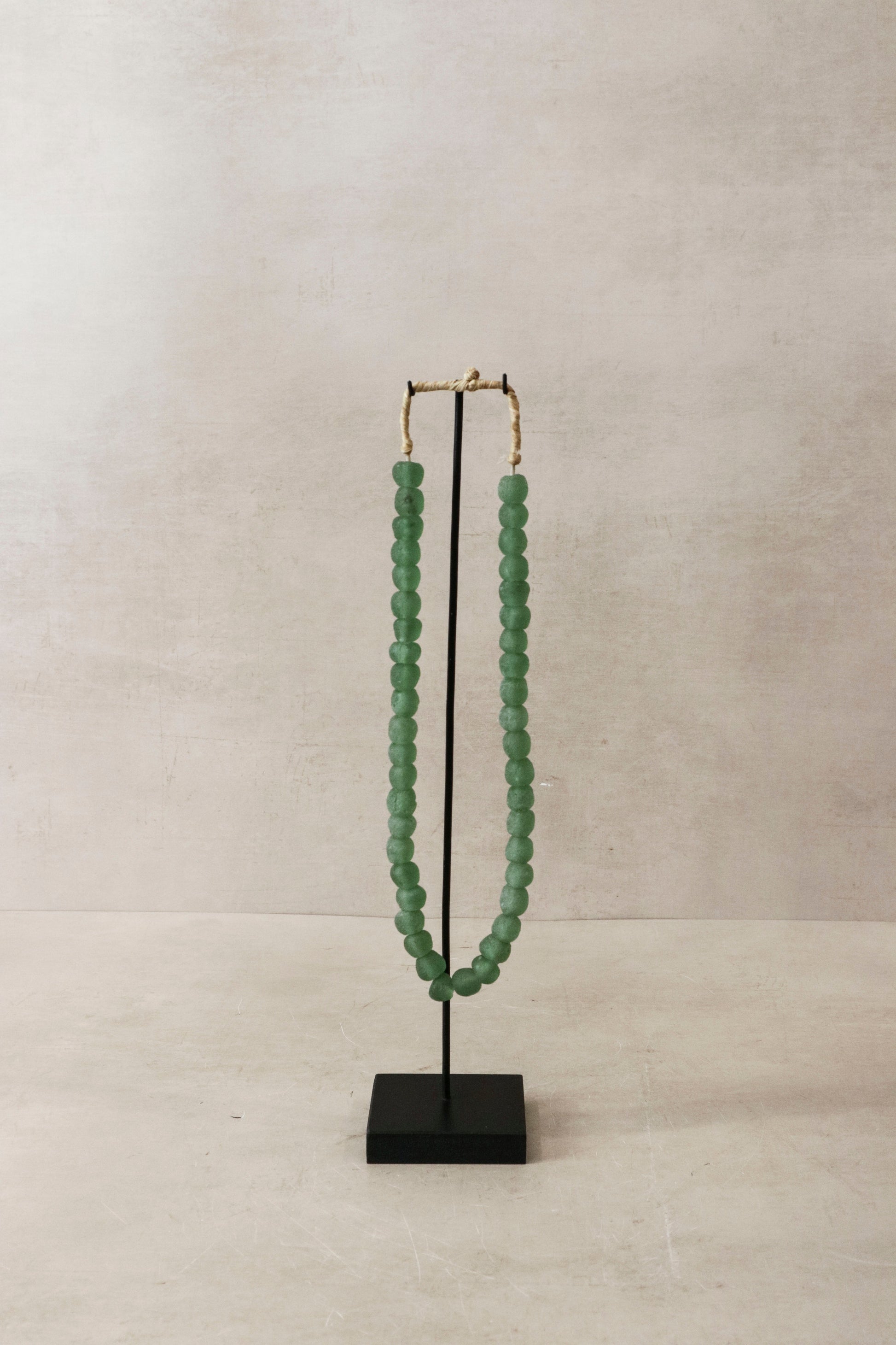 African recycled glass beads are made by members of the Krobo people which is located in Ghana. These beads are created by compressing glass into a dry grain, and heating the grain so that the pieces form together. The recycled glass is rushed into a porcelain cast. The stem of a cassava leaf is used to make the hole. It is baked in a furnace causing the glass to melt together and cassava stem to burn. This technique has been used in Africa for centuries to make recycled glass beads.