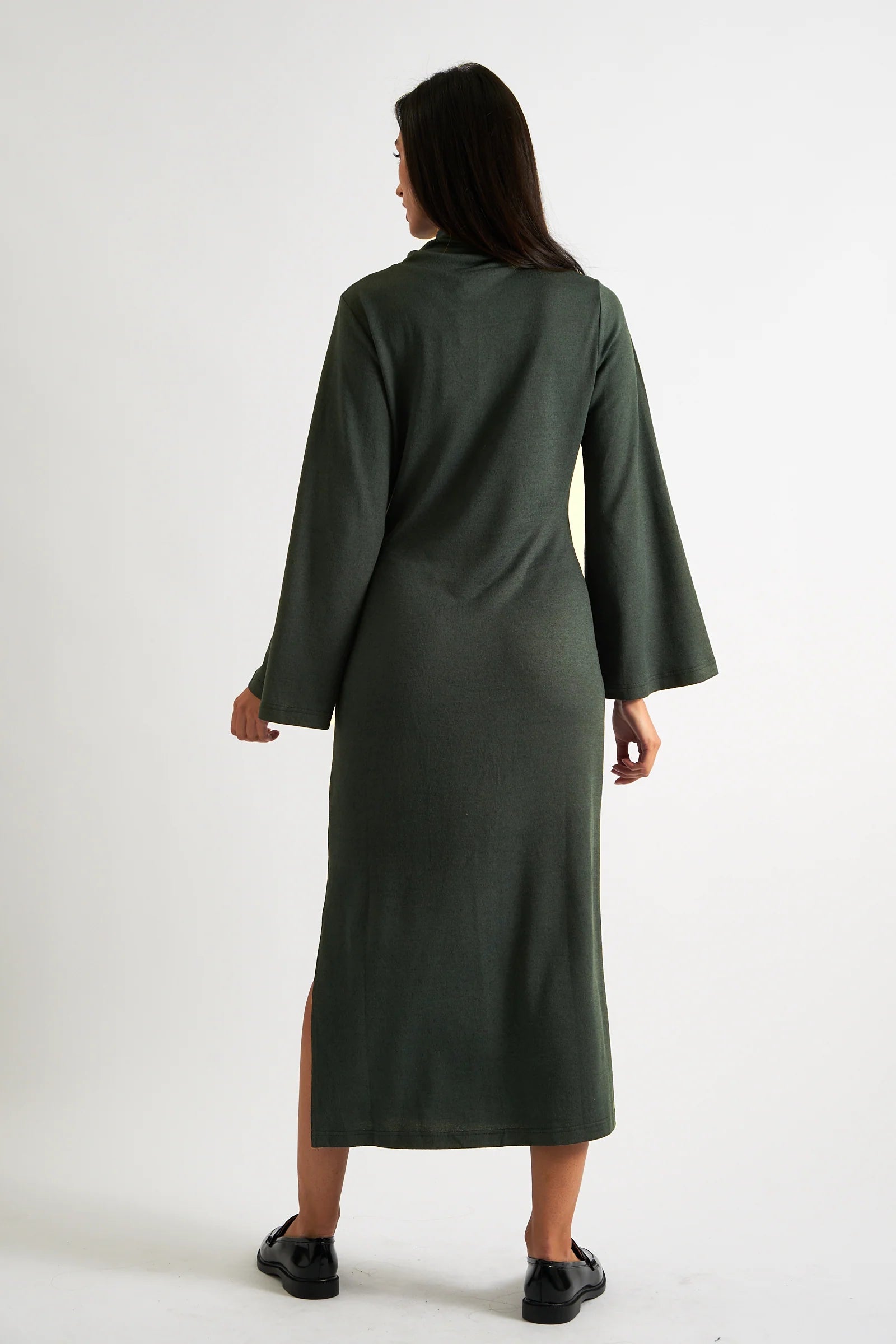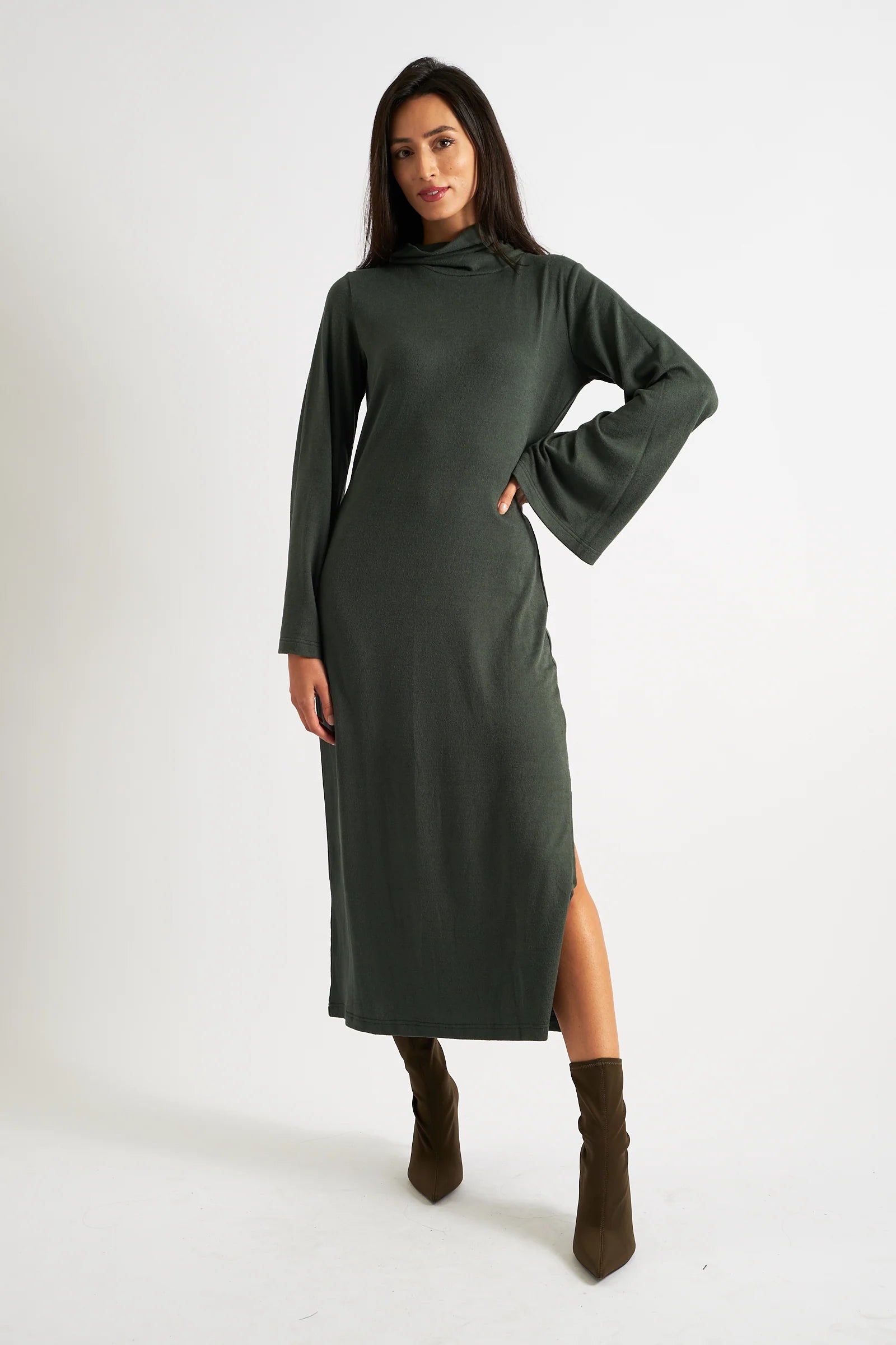 Get cosy and chic with the Gigi brushed marl jersey midi dress. In a flattering forest green . Featuring a soft polo neck, flared sleeves, and a side slit. A wear on repeat dress, a must-have for your wardrobe right now!