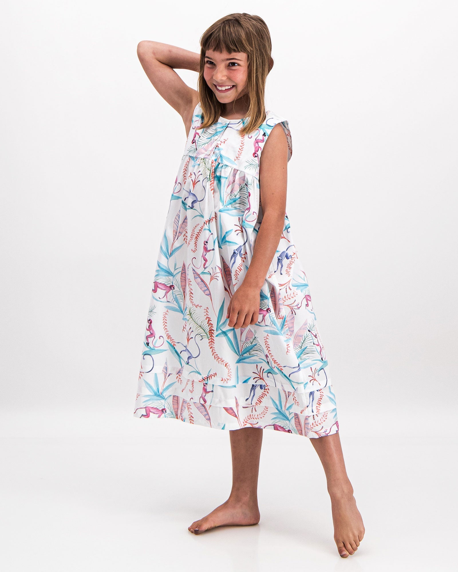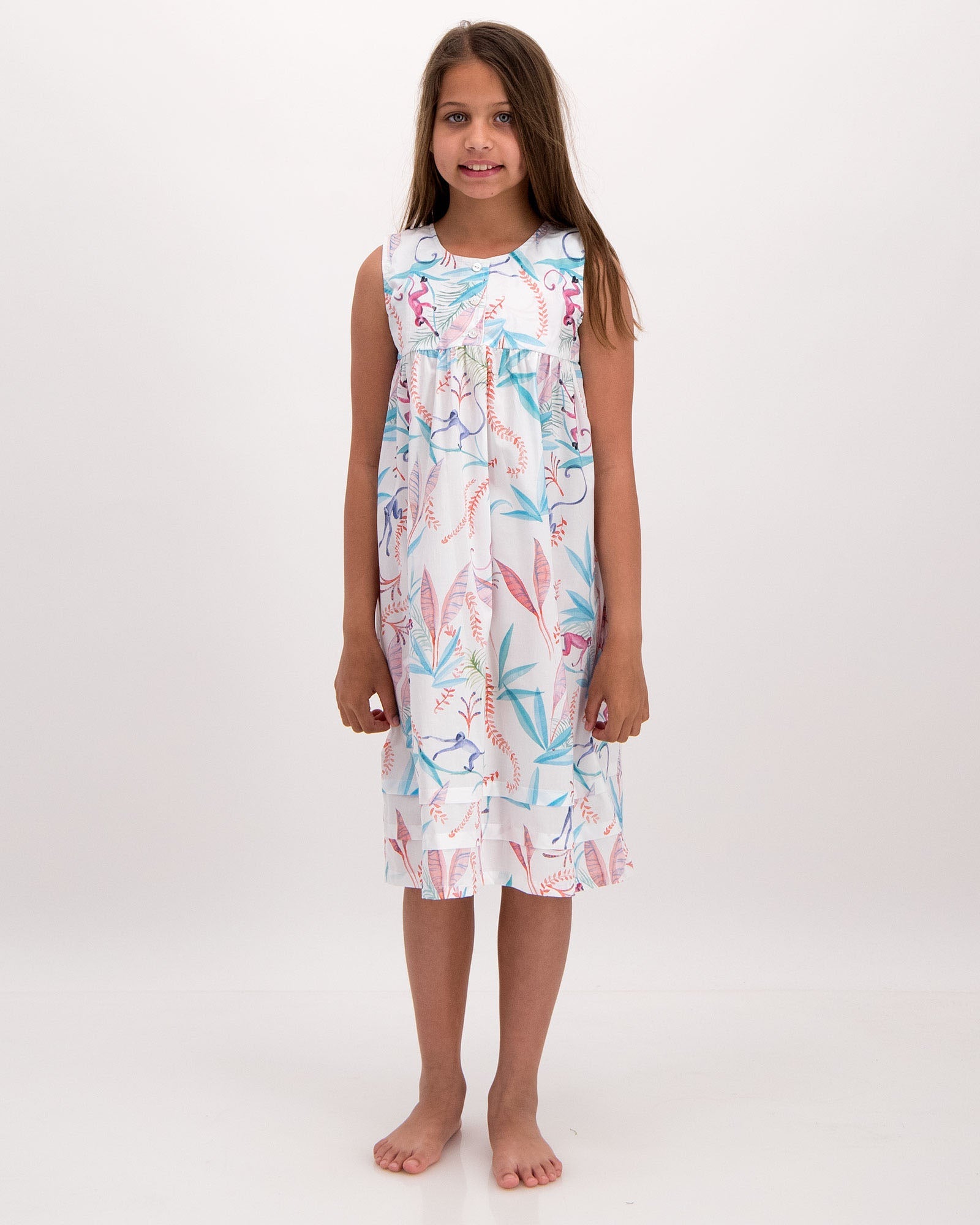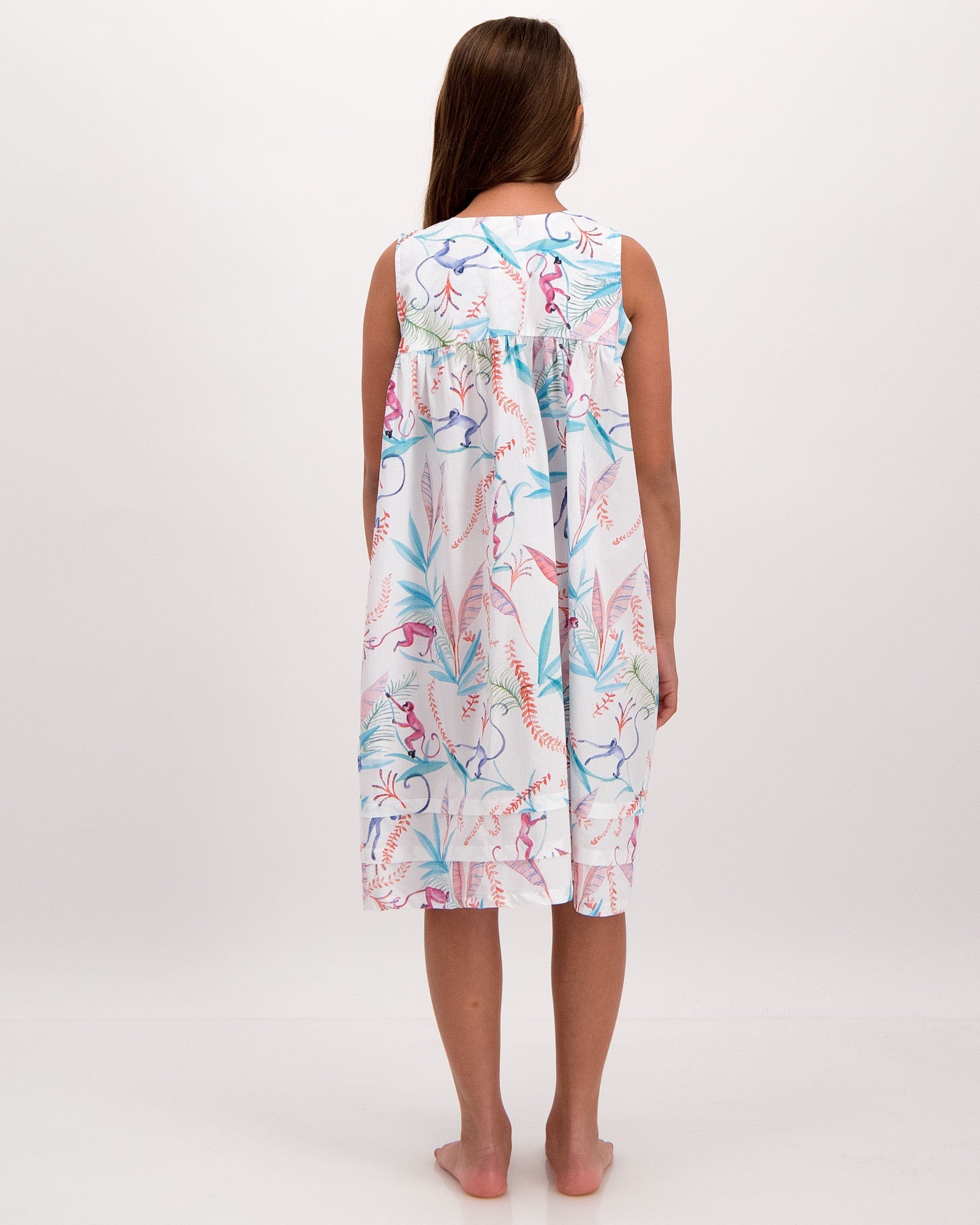 This Girls' Nightie is cut to be comfy and relaxed. Made from soft organic cotton, featuring cute pleats, this nightdress features our fun night monkeys pattern. Our kids' garments are pre-washed for softness and comfort.