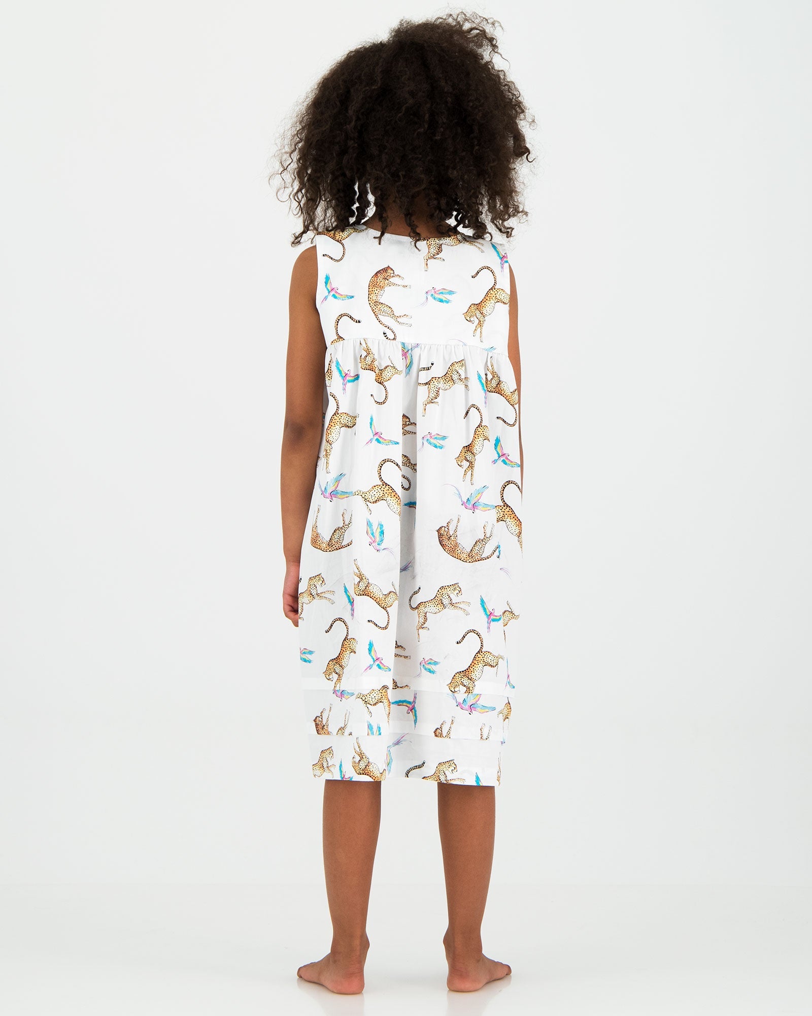 This handmade Girls' Nightie is cut to be comfy and relaxed, with a comfortable loose fit and gathered front, this organic cotton nightdress features our cute playing cheetahs pattern.
