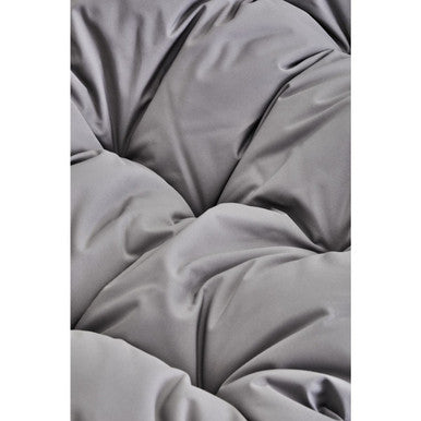 This double hanging chair has a wide seat that is crafted from black rattan effect and is furnished with dense foam-filled grey cushions. The black metal frame complements the texture of the seat and offers stability with its round base.