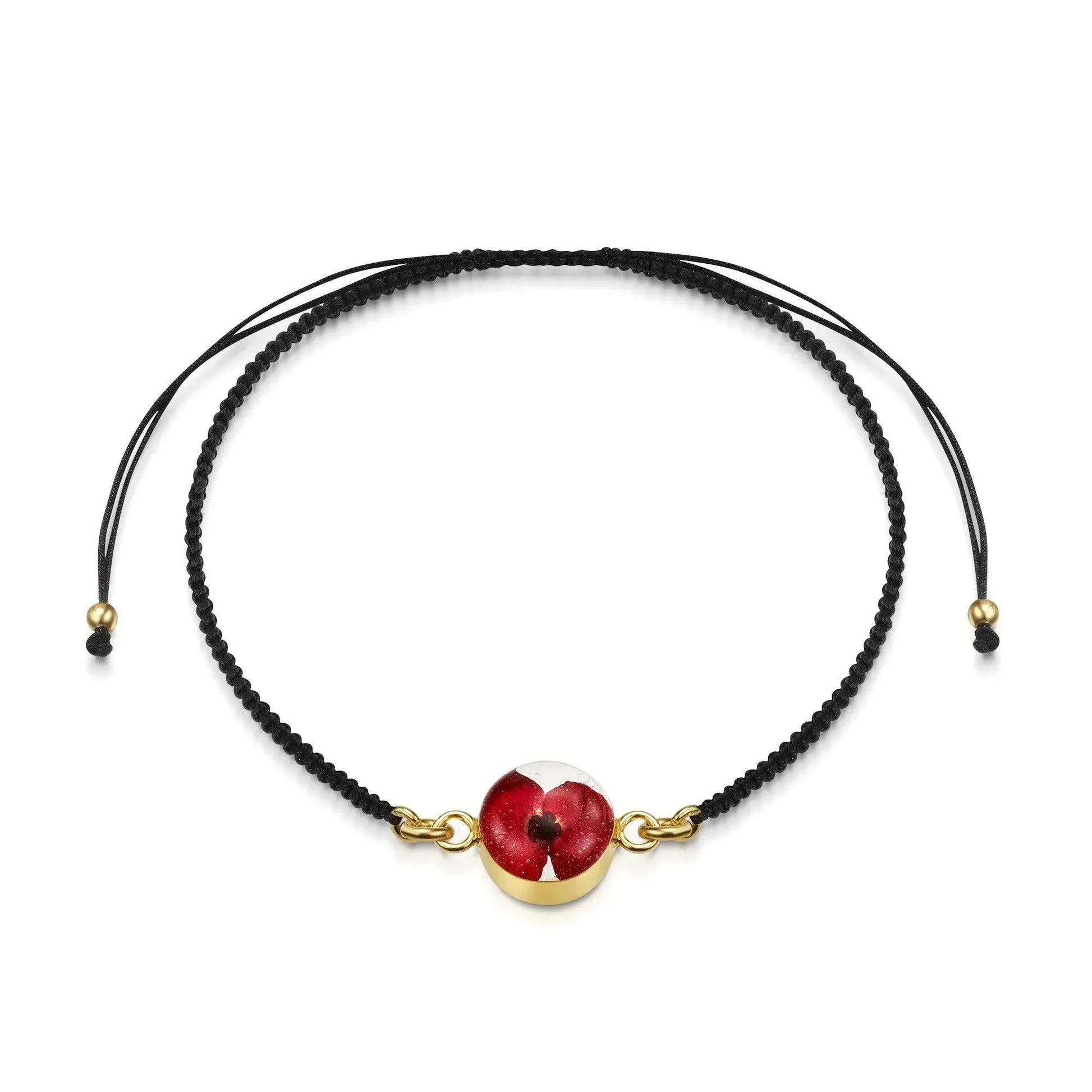 Gold plated black woven bracelet with flower charm - Poppy - Round