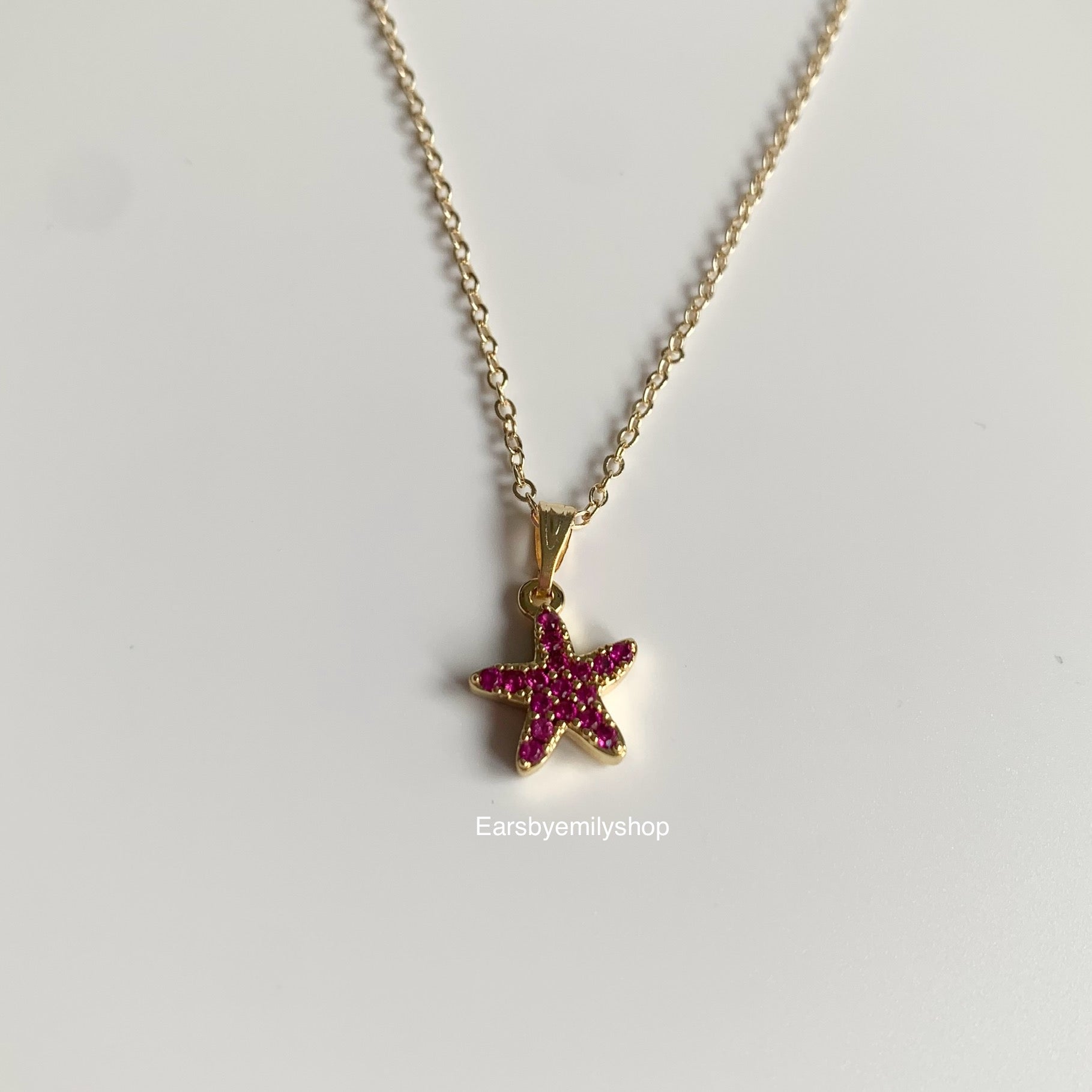 A beautiful gold plated pink crystal starfish pendant handmade necklace on a 24k gold plated chain.