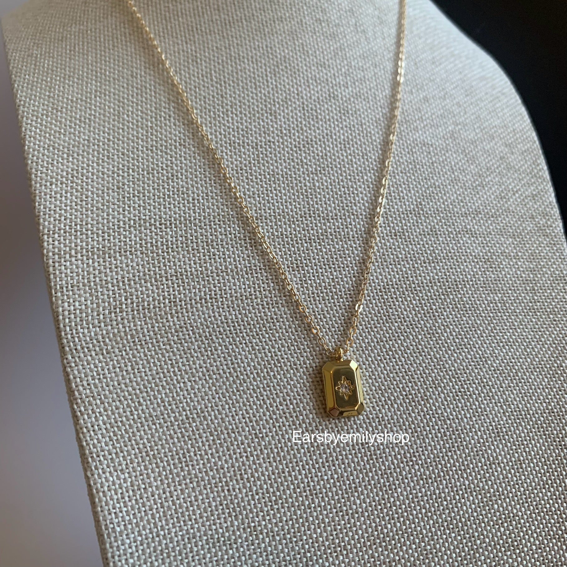 A beautiful gold plated rectangular pendant with star crystal pendant handmade necklace on a 24k gold plated chain.