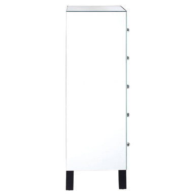 The Graciela 5 Drawer Chest by Orsina brings boutique glamour to bedroom storage. Orsina wraps the façade in mirrored panels and finishes each of the five drawers with faceted cut glass handles that catch and scatter light.