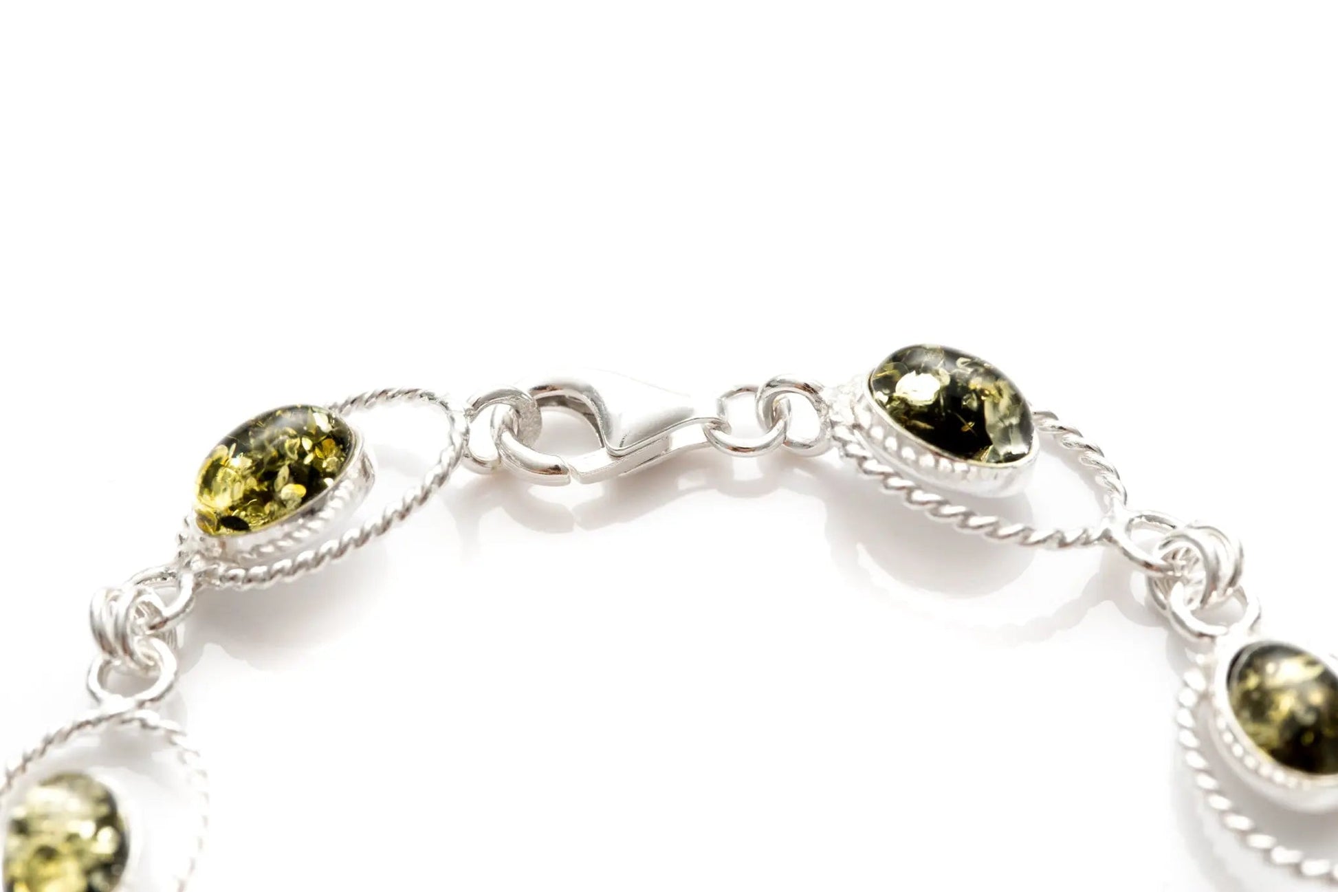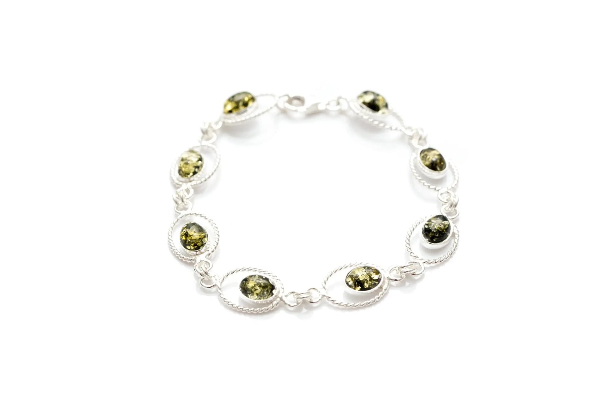 A timelessly classic silver link bracelet with green amber gemstones. Featuring oval, hand-cut amber pieces, set within a minimal sparkling sterling silver rope frame.