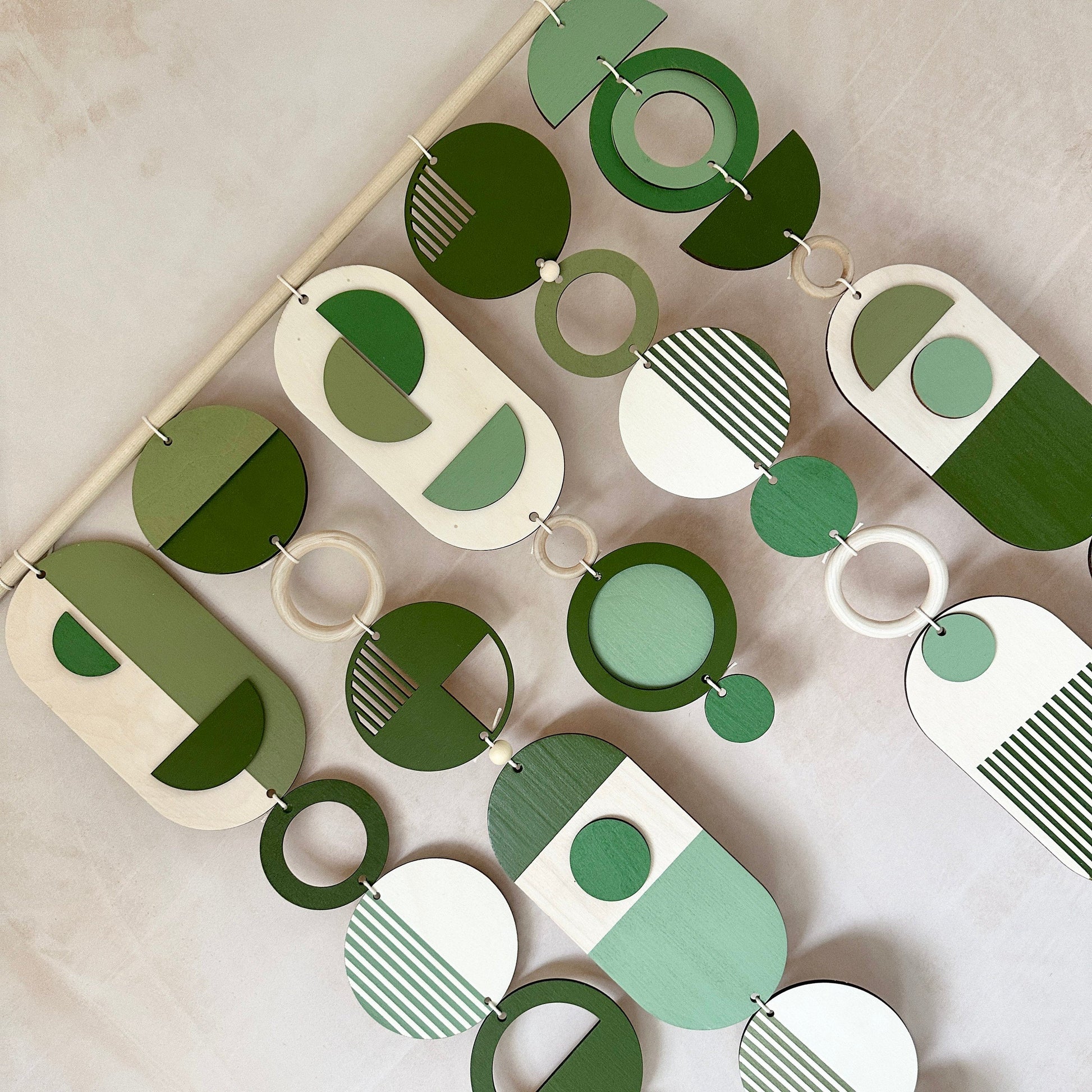 Lovingly handmade modern wall art. This Piece is made from plywood, paint, waxed cord and wooden beads. The colours used are all green tones. This large wall hanging would make a beautiful addition to any room to create a modern mid-century feel. Made from sustainable Birch plywood, hand painted and constructed in Milton Keynes, England.